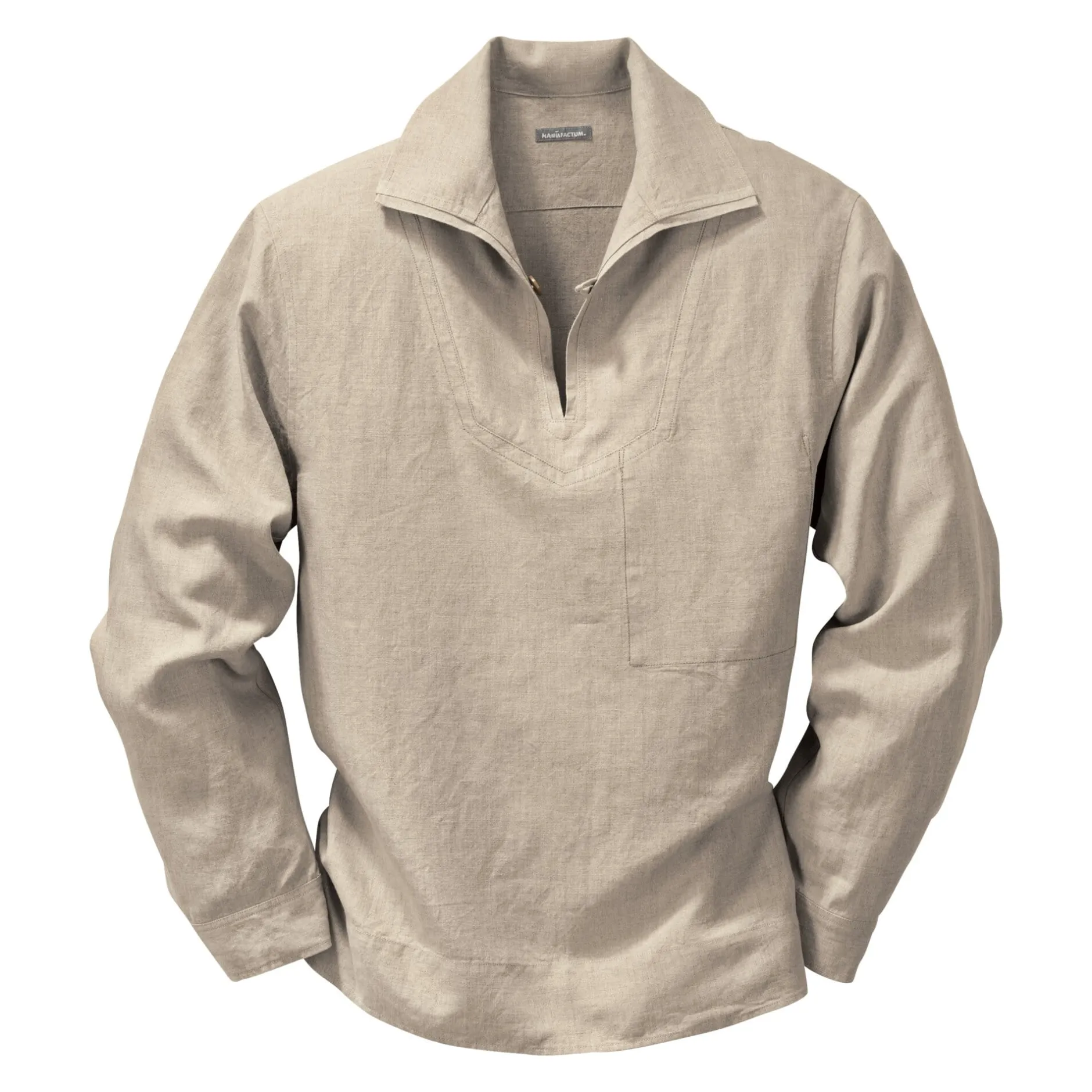 Dieses ursprüngliche Fischerhemd in Form einer klassischen Vareuse, was wörtlich übersetzt Hemdbluse heißt, ist in der Form äußerst einfach – mit einem Einsatz, einem Schlitz und einem umzuschlagenden Einstückkragen. Um bei der Arbeit nirgendwo hängenzubleiben, haben Fischerhemden traditionell keine vorstehenden Knöpfe. Wir haben uns daran gehalten: Der einzelne Knopf, der mitsamt einer Schlaufe den Schlitz am Halsausschnitt schließt, sitzt innen, die Brusttasche liegt ebenfalls innen. Früher wurde solch ein Hemd aus Segeltuchresten geschnitten, was für heutige Verhältnisse unangemessen schwer wäre. Unser Fischerhemd wird aus Leinen mit einer für Hemden immer noch ungewöhnlich schweren Qualität konfektioniert.