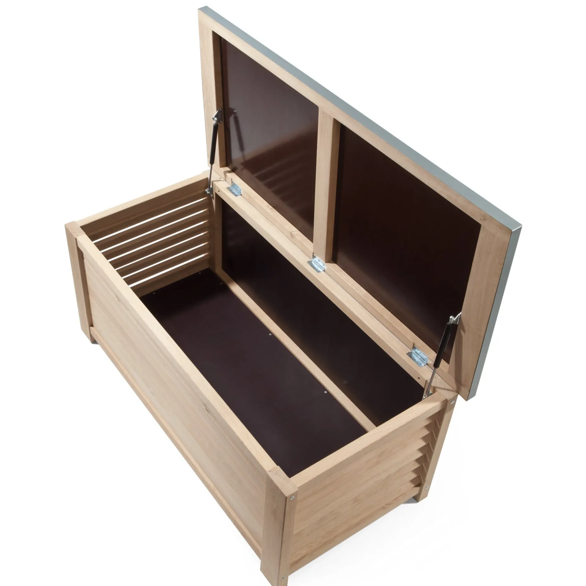 Ein schönes, massives Möbel, das in seinem geräumigen Inneren den Sommer über die Sitzauflagen Ihrer Gartenmöbel aufnimmt. Oder Sandkastenpielzeug, Federballschläger, Bollerwagen und das rote Rutschauto, Wäscheklammern und Teppichklopfer, Gartengerätschaften, Werkzeuge – und vielleicht auch noch Holzkohle und Grillzubehör. Front und Seitenteile der Truhe sind aus unbehandeltem Eichenholz gefertigt, Boden und Rückwand aus feuchtebeständiger Siebdruckplatte. Der Deckel ist in Rahmenbauweise gearbeitet und mit einer Auflage aus Zinkblech belegt; zwei Gasdruckdämpfer halten ihn im geöffneten Zustand oben und sorgen durch ihre abbremsende Wirkung für ein sanftes Schließen. Er ist so stabil, dass die Truhe problemlos auch als Sitzgelegenheit genutzt werden kann. Die seitlich eingearbeiteten, offenen Lamellen gewährleisten eine gute Durchlüftung des Truheninneren – sie bedingen aber auch, dass das Möbel nicht wasserdicht ist. Beachten Sie dies bitte bei der Aufstellung der Truhe bzw. auch bei der Auswahl des Lagerguts.