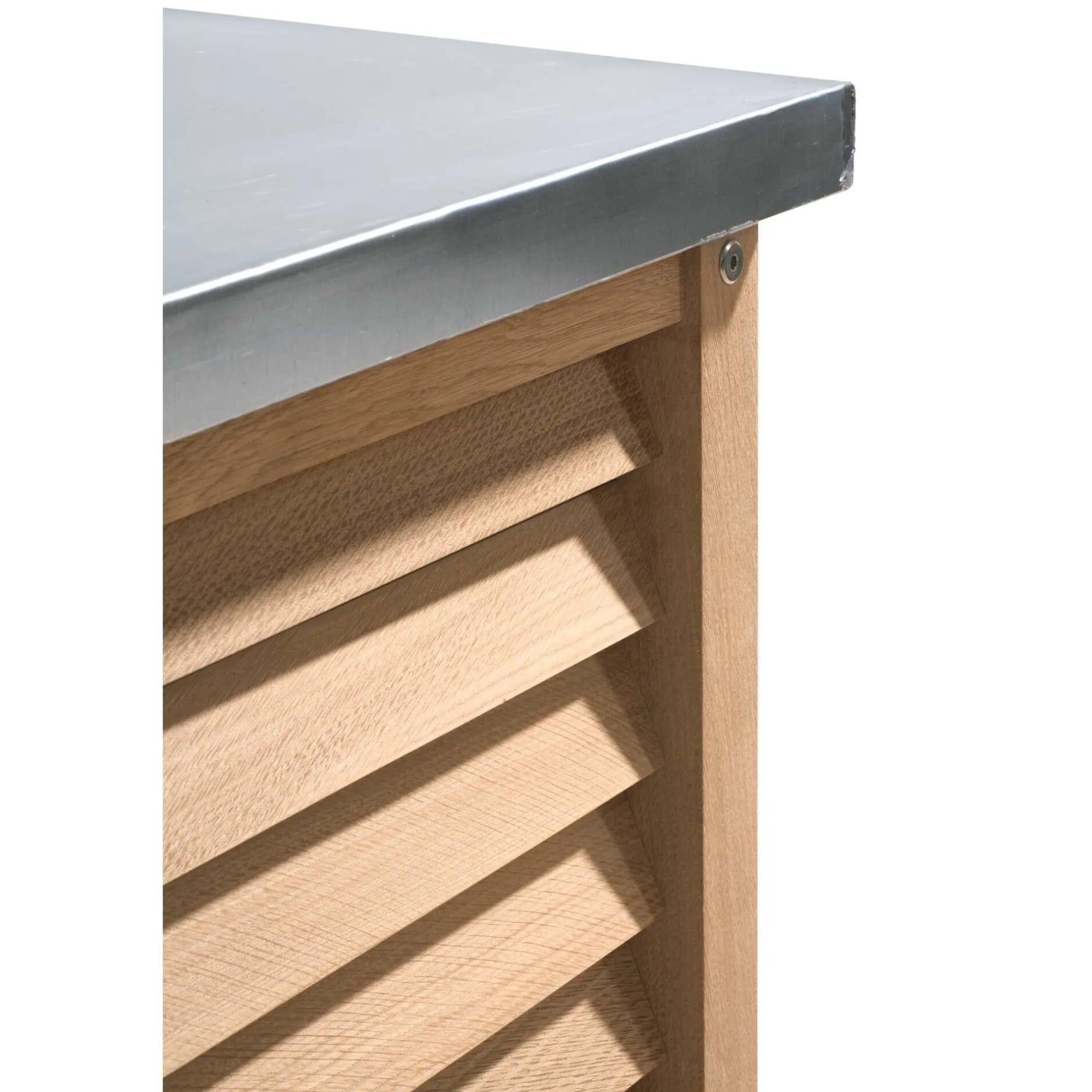 Dieses Terrassenmöbel wird für uns in einer Lüneburger Möbelwerkstatt aus dem witterungsbeständigen Holz der Eiche in Stollenbauweise und massiver Ausführung gefertigt: Die Längszargen sind mittels metrischer Schraubverbindungen mit Quergewindebolzen gesichert und die Querzargen wasserfest verleimt. Die Ablageflächen sind mit solidem Zinkblech belegt – das hält; in Frankreich zum Beispiel hat Zinkblech eine lange Tradition als Arbeitsfläche auf Küchentischen. Die Füße sind mit Kunststoffgleitern versehen, die Nässe von unten abhalten und Terrassenplatten schonen.