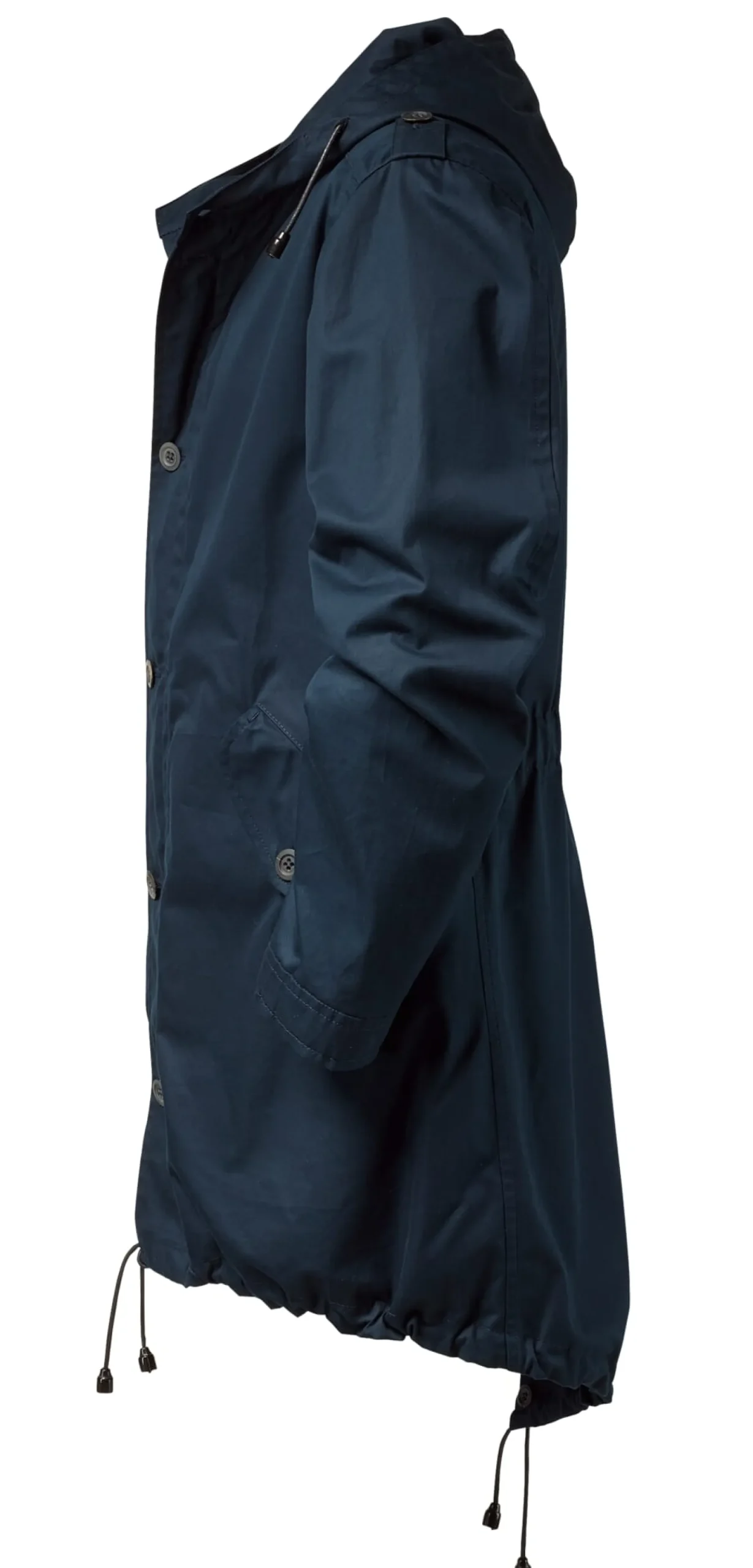 100% Baumwolle (EtaProof®). Enthält nichttextile Teile tierischen Ursprungs: Echthornknöpfe und -kordelstopper. Pattentaschen, Ärmelsaum mit Gummi im Tunnelzug, innenliegender, in Taillenhöhe mit Knöpfen verstellbarer Tunnelzug. Riri-Metallreißverschlüsse, Metallschließe an der Kapuze. Hergestellt in Polen. Rückenlänge bei Größe L = 110 cm.