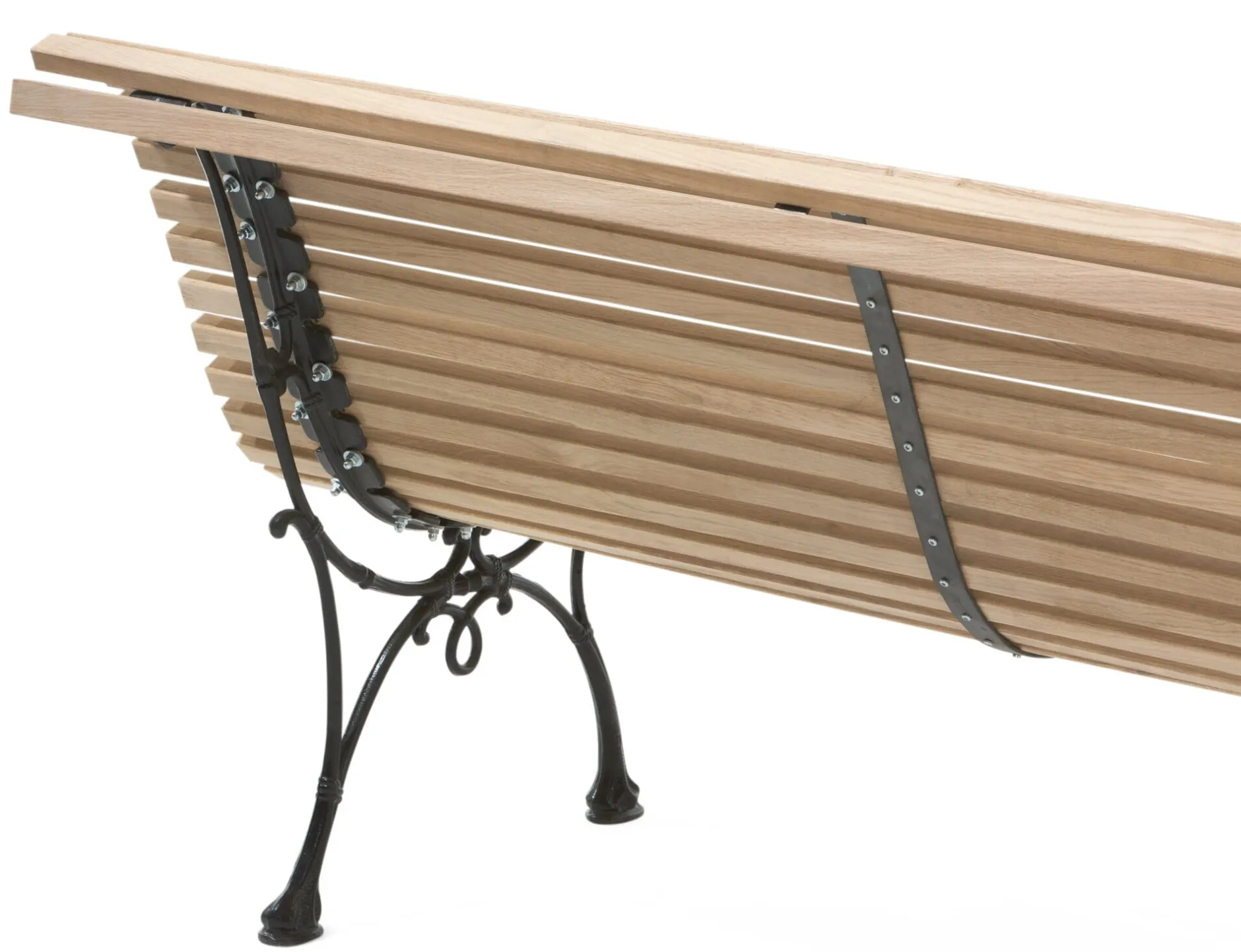 Füße Gusseisen, schwarz pulverbeschichtet. Belattung unbehandeltes Eichenholz in natürlicher Astigkeit (Herkunft Deutschland). Hergestellt in Frankreich und Deutschland. Höhe 79,5 cm, Breite 150 cm, Tiefe 70 cm. Sitzhöhe 40 cm, Sitztiefe 38 cm. Gewicht 31 kg.