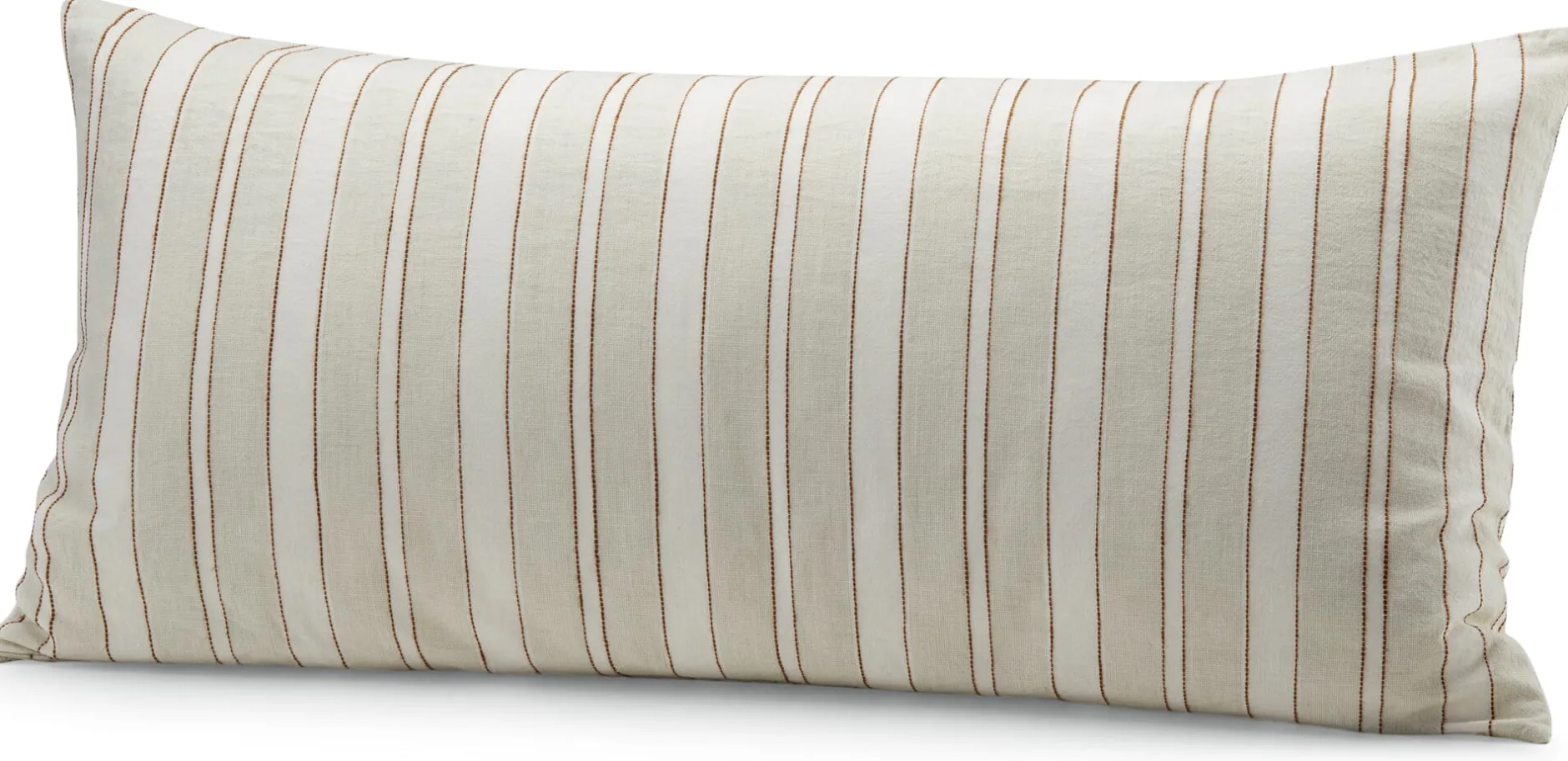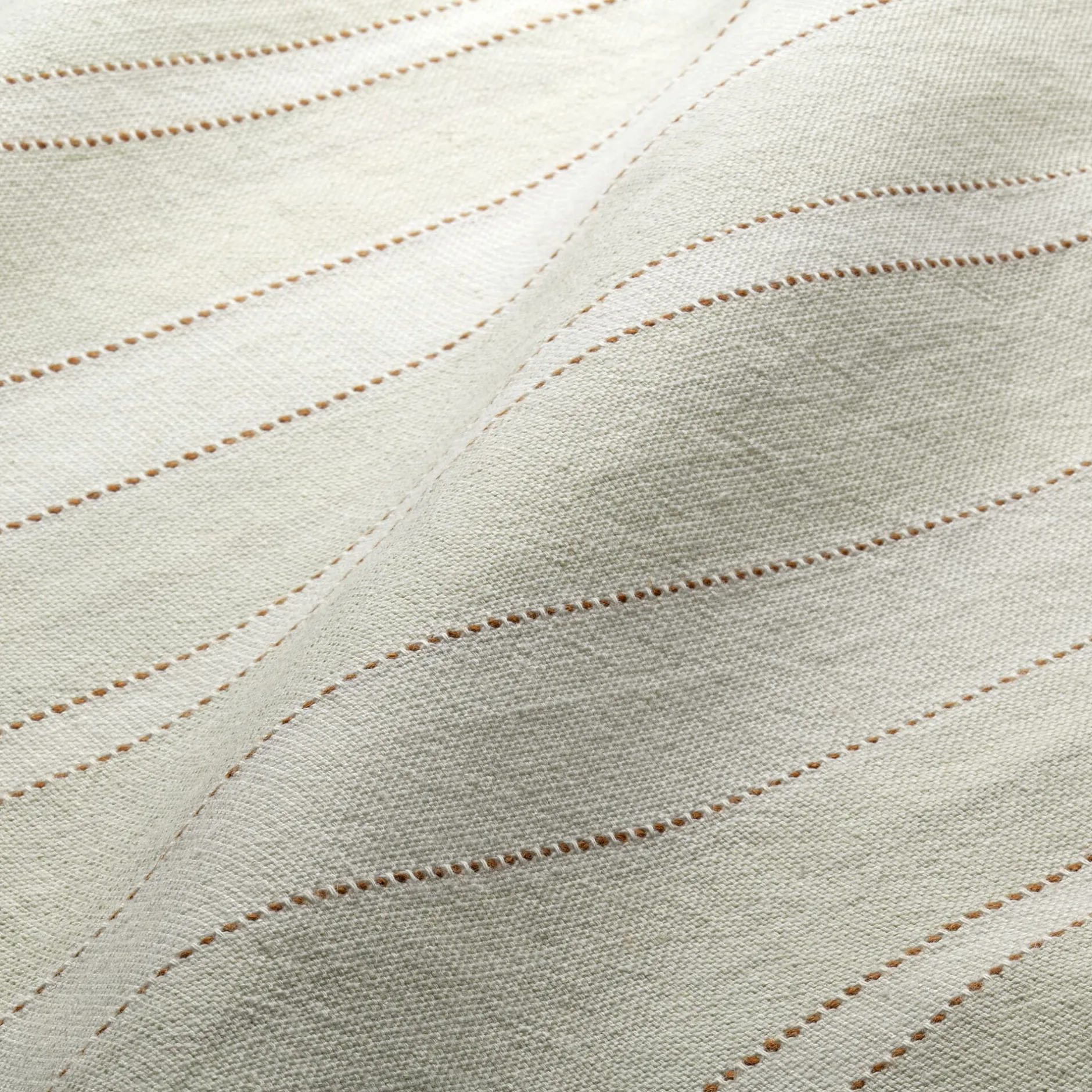 Besonders spannend ist aber der sichtbare Kontrast, denn die einzelnen Materialien zeigen sich in den verschiedenen Streifen: Aus reiner Baumwolle sind die hellen Streifen gewebt, für die naturfarbenen wird im Schuss naturbelassenes Leinen verwendet. Ein kräftigerer, roter Schussfaden aus Leinen setzt die Streifen kontrastierend voneinander ab, so entsteht ein zwar dezentes, dennoch lebendiges Streifenmuster, das sich leicht in jedes Schlafzimmer einfügt. Alle Kopfkissenbezüge sind mit Holzknöpfen versehen.