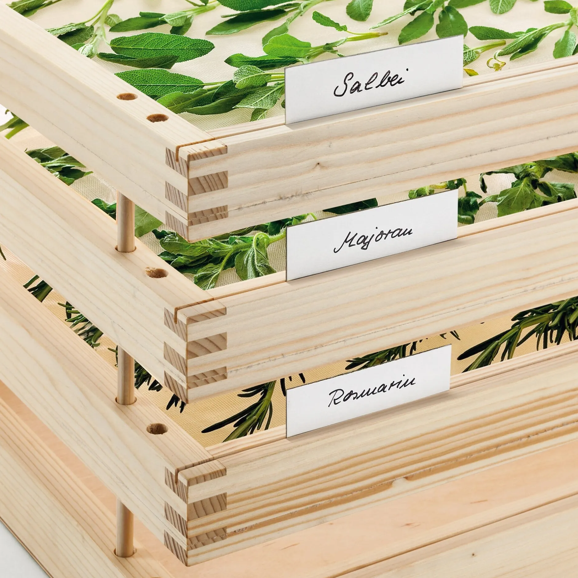 Dieser Kräutertrockner nimmt auf drei Etagen ansehnliche Mengen Kräuter, Apfelringe oder Pilze auf und trocknet sie ganz ohne Stromzufuhr. Er besteht aus fünf Elementen: einem Deckel, der als Schutz vor direkter Sonneneinstrahlung dient, drei Netzböden (das gleiche robuste Material wird im Obstanbau als Hagelschutznetz verwendet), die das Dörrgut aufnehmen, und einem Boden, der den Trockner von unten vor Kälte und Nässe schützt. Die durchdachte Konstruktion gewährleistet, dass er bei Nichtgebrauch zu einer kompakten, rundum geschlossenen Kiste wird. Zum Gebrauch werden die Böden einfach um 180° gedreht. Auf diese Weise entsteht ein Zwischenraum, der bei jedem der Böden eine gute Luftzirkulation gewährleistet. Die Böden sind an der Vorderseite mit einer durchgehenden Nut ausgestattet, in die sich Beschriftungskärtchen einfügen lassen. Alle Holzteile bestehen aus feingeschliffenem und unbehandeltem Fichtenholz, die Eckverbindungen sind als Fingerzinken gearbeitet. Der Kräutertrockner wird in Sachsen komplett in Handarbeit gefertigt.