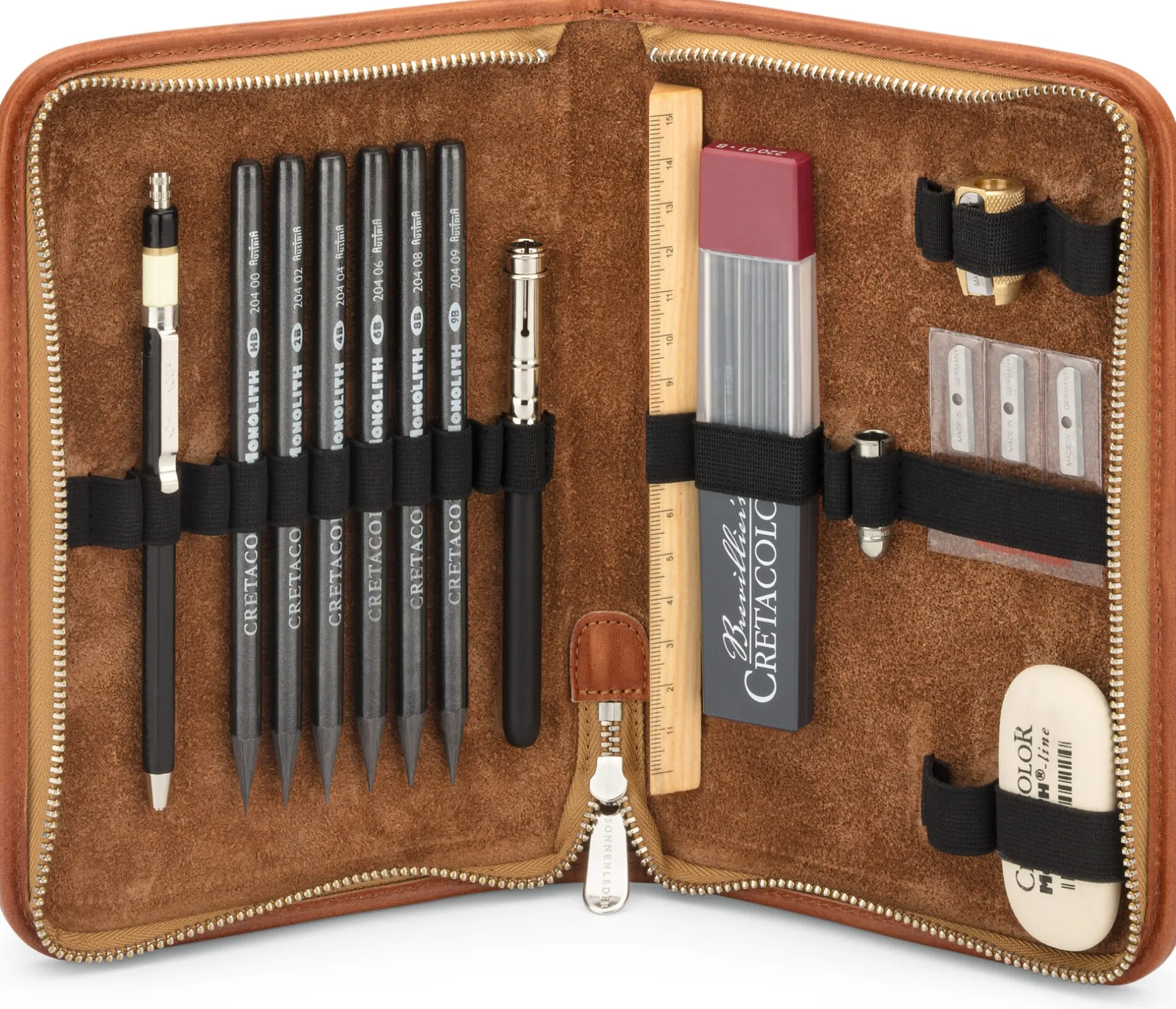 … um ein Schreibetui so zu füllen wie dieses: sechs Monolith-Grafitstifte (alle Gradationen), ein Koh-i-Noor Minenhalter mit zwölf Ersatzminen aus Grafit (Ø 2 mm), ein Bleistiftspitzer Granate mit drei Ersatzmessern, ein kleines Dreikantlineal (15-cm- und 6-Inch-Skala) aus unbehandeltem Ahornholz, ein Radiergummi, ein Bleistiftverlängerer, eine Bleistiftkappe. Das Etui aus handschmeichelndem grubengegerbtem Allgäuer Rindleder ist sorgfältig vernäht und wird mit der Zeit und dem Gebrauch eine individuelle Patina annehmen.