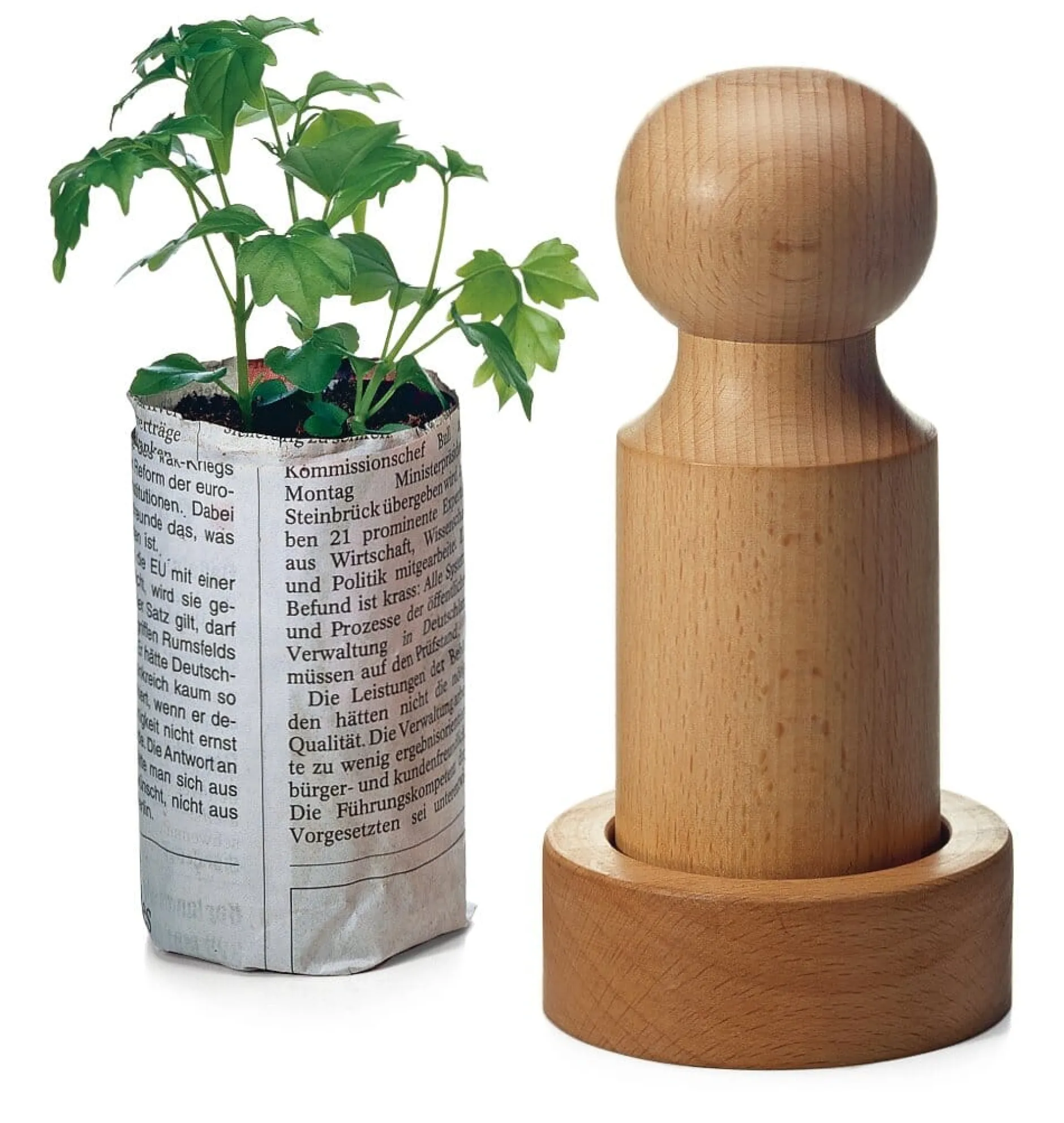 Mit dieser hölzernen Presse können Sie aus Zeitungspapier Aussaattöpfchen herstellen. Dazu wird ein Streifen Zeitungspapier um den Zylinder gelegt, unten umgeschlagen, das Ganze drehend in die Schale gepresst und das Behältnis schließlich mit Erde befüllt. Ist der Sämling groß genug, kann gleich das ganze durchwurzelte Töpfchen in den Boden gepflanzt werden – das Papier wird sich in kürzester Zeit zersetzen.