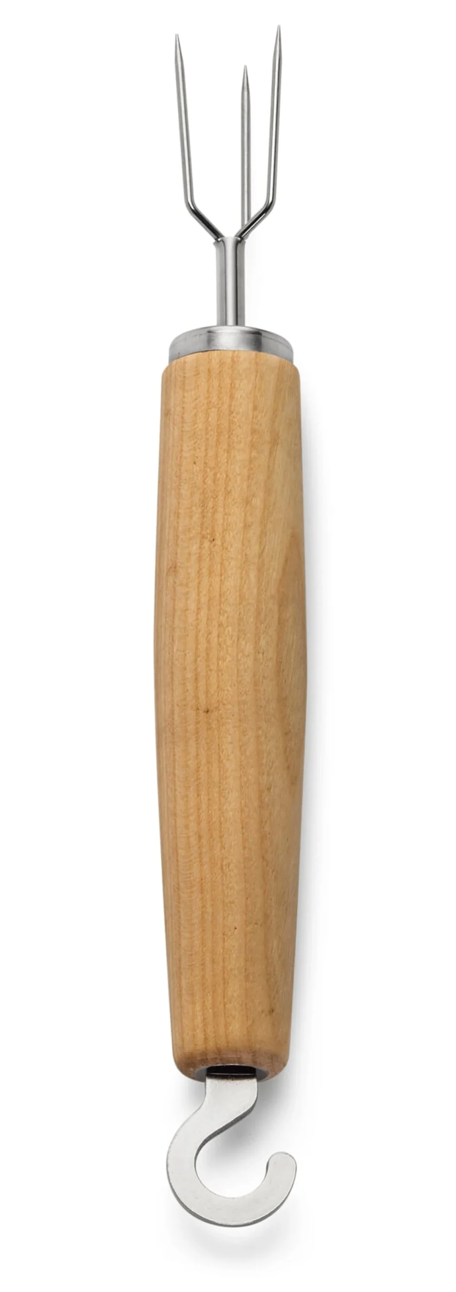 Dreizinkige Gabel aus Edelstahl in der althergebrachten Form. Griff aus Kirschbaumholz mit einer Aufhängeschlaufe aus Edelstahl.