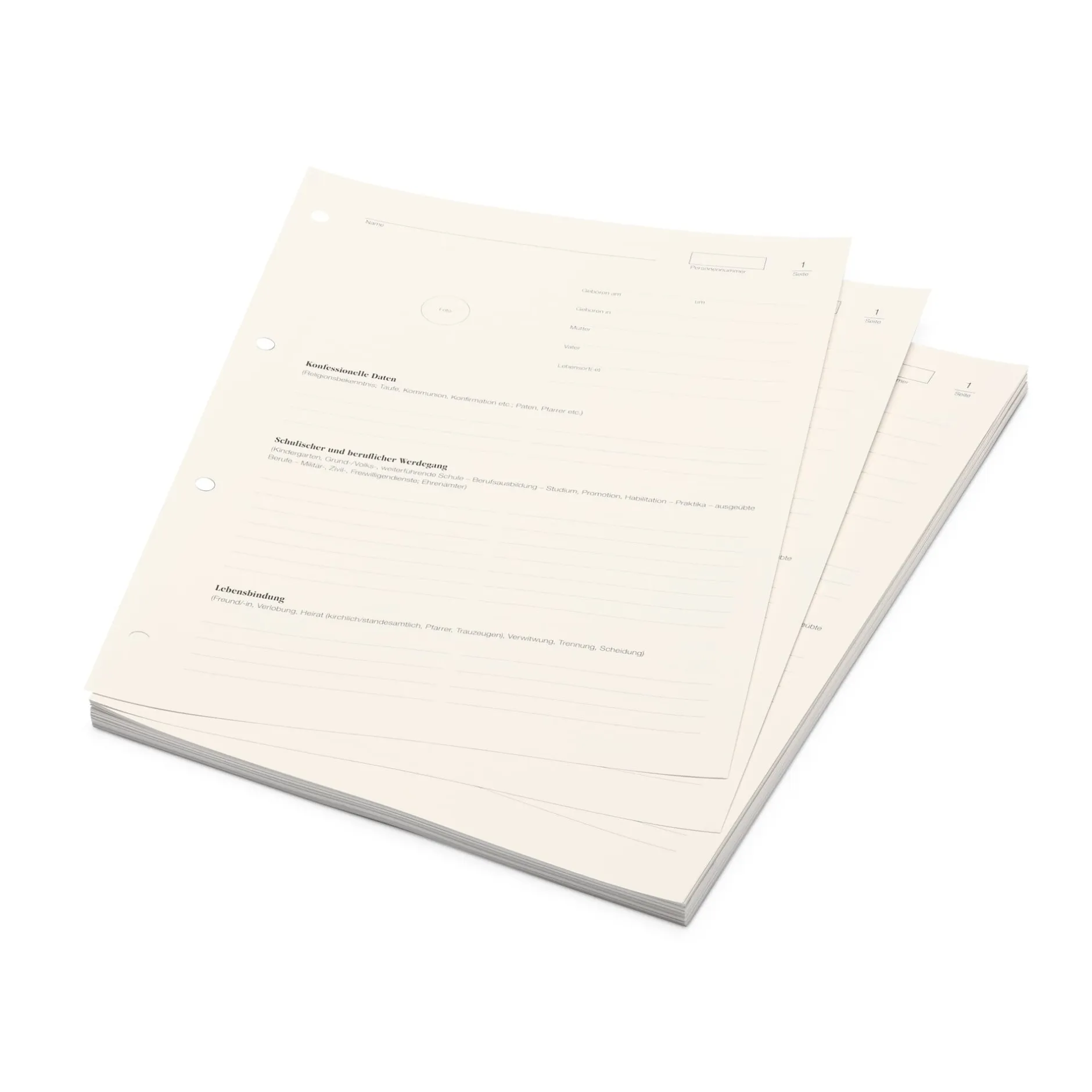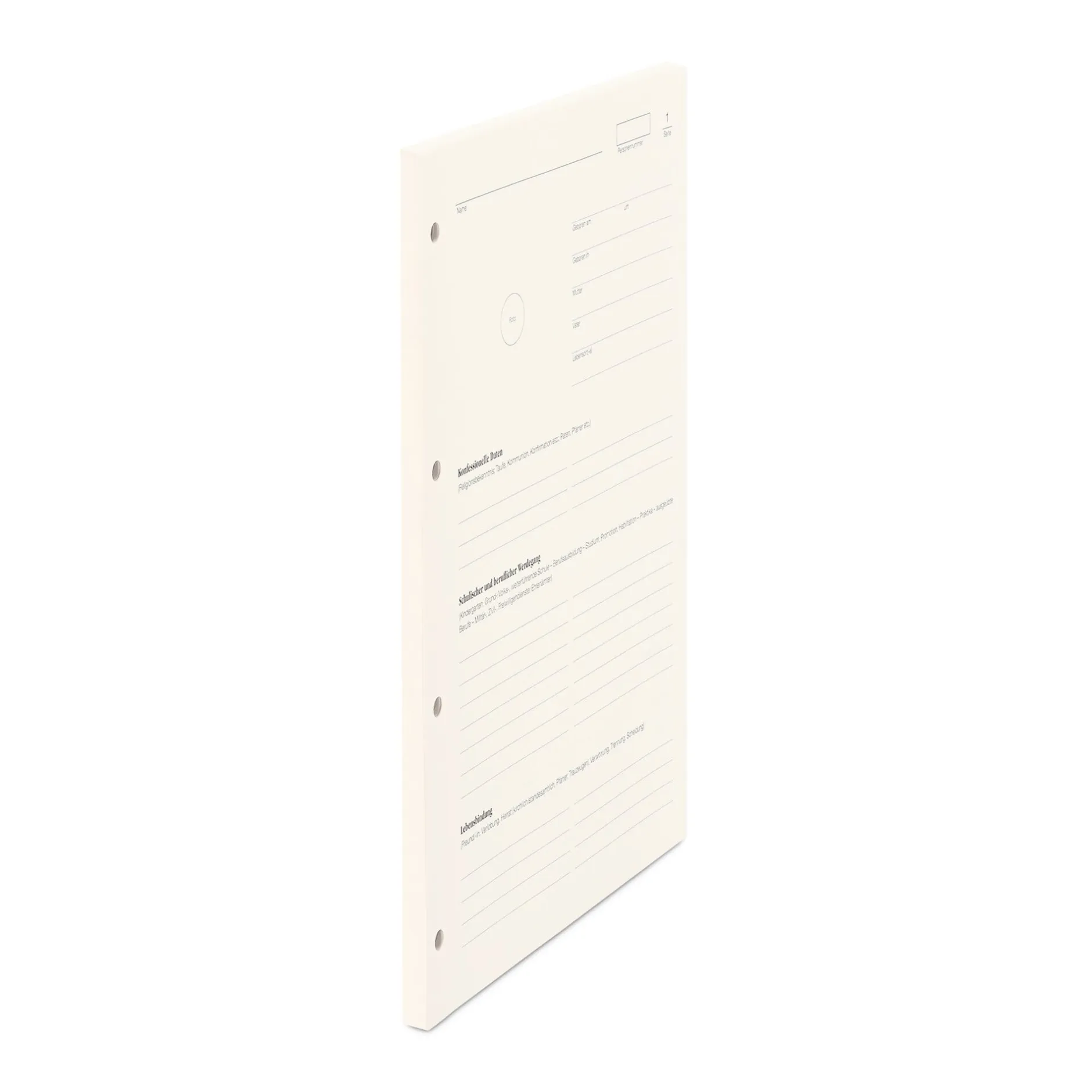 Beidseitig bedrucktes, paginiertes Formular zur Erfassung wesentlicher Personendaten und Informationen, Auftakt und Kern des Registereintrags eines jeden aufgeführten bzw. noch aufzuführenden Familienmitglieds, der durch nebenstehende Folgeblätter beliebig erweitert werden kann.
