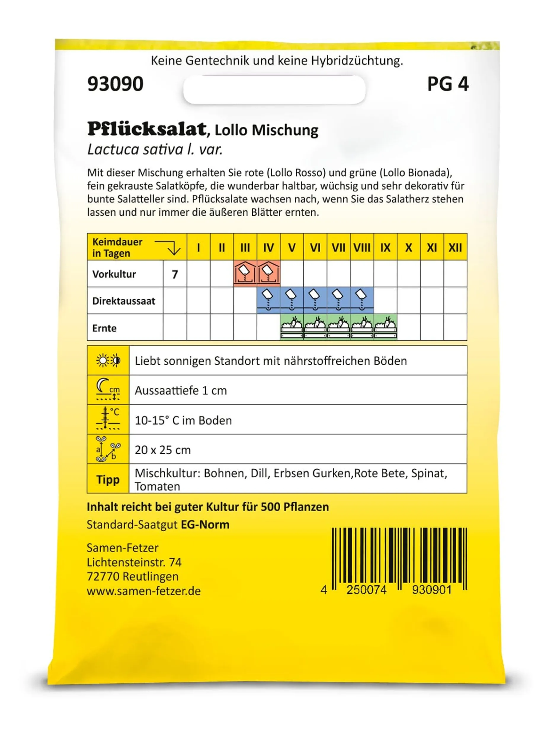 Robuste Pflücksalatsorte mit roten, gekrausten, knackigen Blättern. Sehr gesund und vitaminreich und für den ganzjährigen Anbau geeignet. Bleibt das Herz der Pflanze stehen, kann fortlaufend nachgeerntet werden.