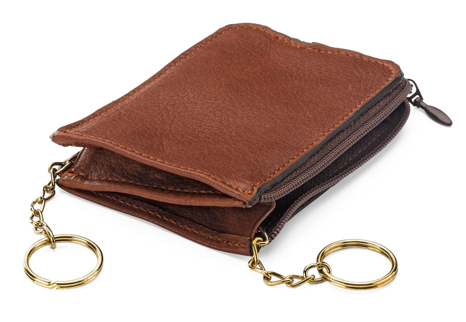 Rindleder (Stärke 1,5 mm), vegetabil gegerbt, Herkunft Deutschland. Farbe Braun. Mit je zwei Schlüsselringen und -ketten aus Messing. Reißverschluss Kunststoff. Hergestellt in Deutschland.