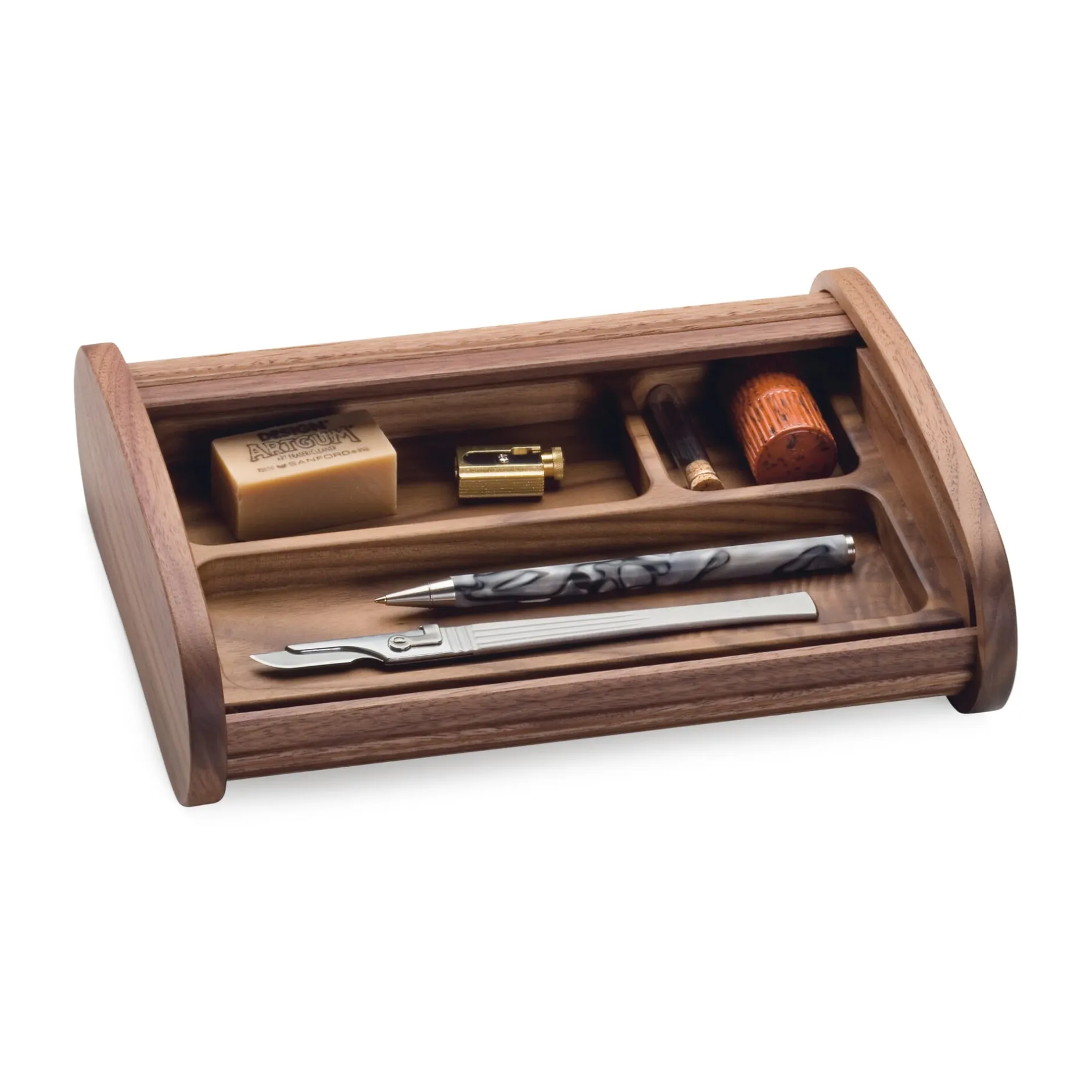 Vollständig aus massivem Nussbaumholz ist diese Stiftablage gemacht. Die gefrästen und sauberst geschliffenen Mulden nehmen Schreibgeräte und Kleinutensilien auf. Der Rollladen wird in einer umlaufenden Nut geführt und einfach mit der flachen Hand bedient. Höhe 7 cm, Breite 24,5 cm, Tiefe 19 cm. Gewicht 520 g. Lieferung ohne Utensilien.