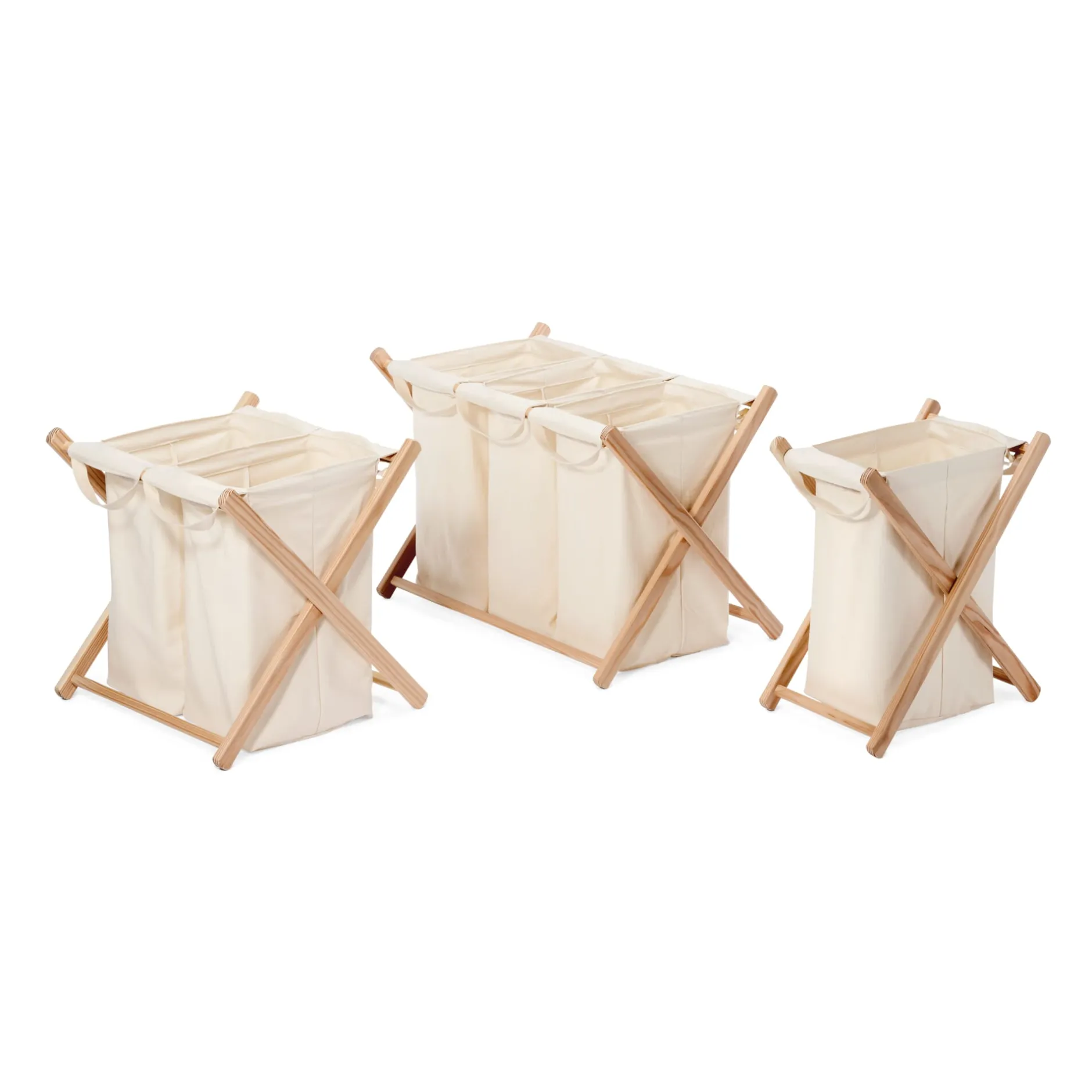 Im westlichen Münsterland entstehen diese Wäschesortierer aus heimischem Lärchenholz und 100% Baumwolle (ungebleicht, mit einem Gewebegewicht von 285 g/qm), die auch abseits von Hauswirtschaftsraum, Wäschekammer oder Keller ansehnlich sind und einen wertvollen Beitrag zur häuslichen Ordnung leisten. Jeder Wäschesack fasst etwa 40 Liter oder mindestens eine Waschmaschinenladung. Die mit Bändchen befestigten und bei 60 °C waschbaren Einhängebeutel können einzeln entnommen werden, sie sind mit Trageschlaufen für den Transport der Wäsche zur Waschmaschine versehen. Die zusammenklappbaren Holzgestelle werden montiert geliefert.
