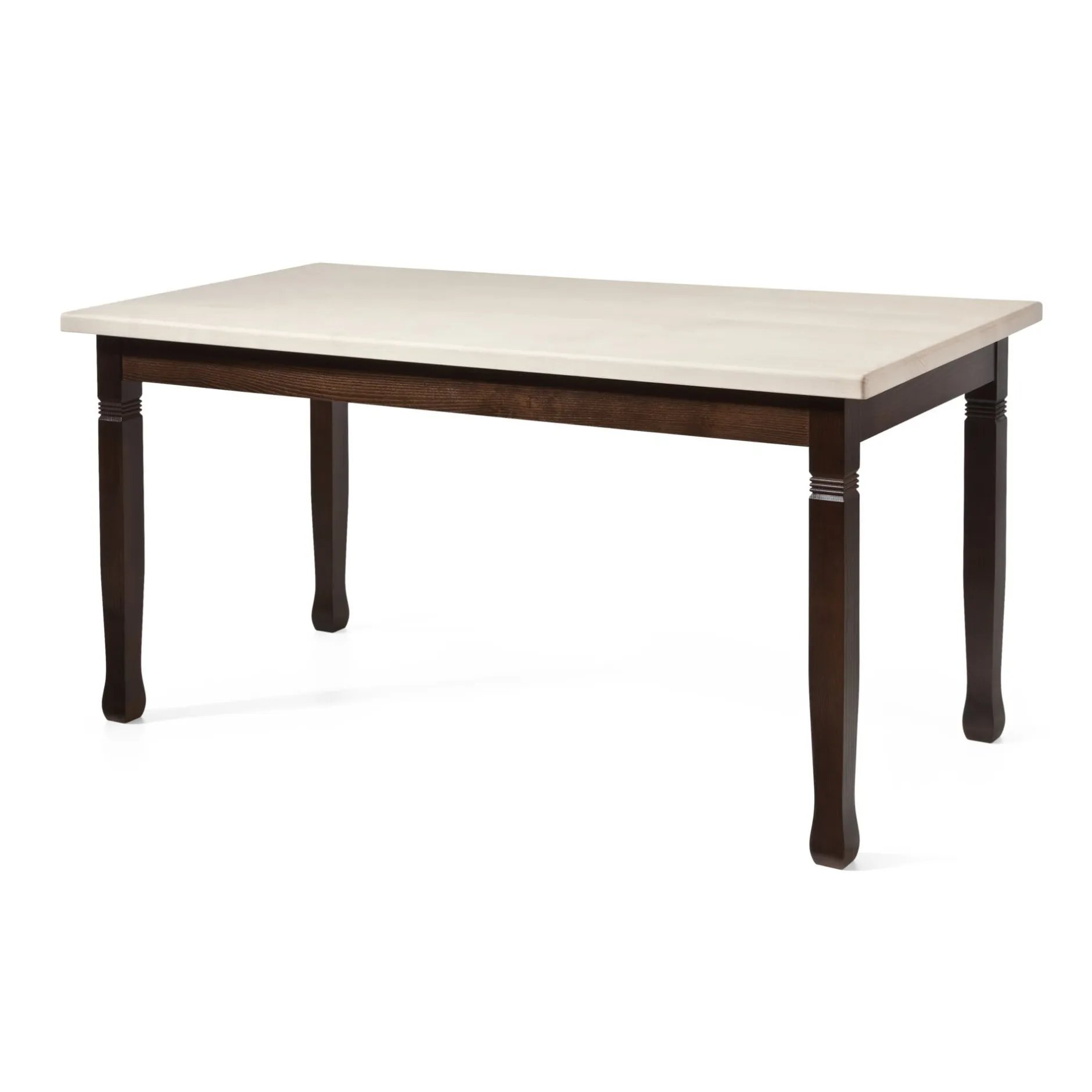 Platte massives Ahornholz (Herkunft Deutschland), gebleicht und geseift, Stärke 38 mm. Tischzarge und Beine Buchenholz massiv (Herkunft Deutschland), dunkel gebeizt und klar lackiert. Nutklötze als Verbindung zwischen Gestell und Platte. Höhe 77 cm.