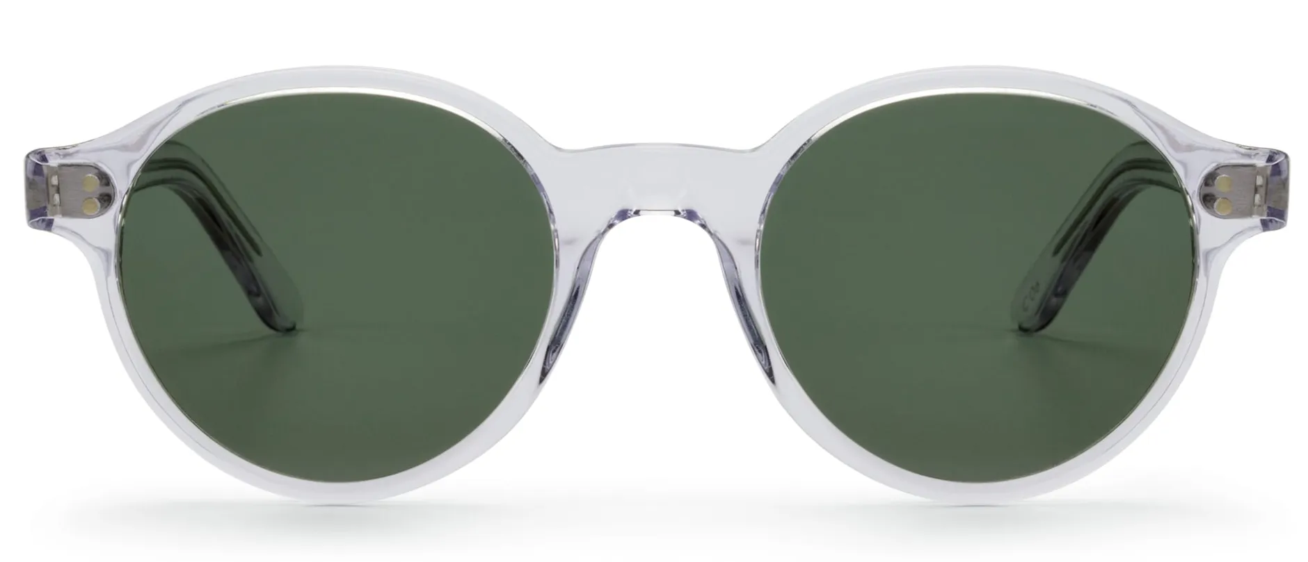 Optisch nimmt sich das klare, von Modellen der 1980er Jahre inspirierte Azetatgestell dieser Sonnenbrille deutlich zurück. Ins Auge fallen vielmehr die ins Grünliche gehenden Kunststoffgläser der Kategorie 3. Durch ihren starken Tönungsgrad schützen sie in fast allen Situationen vor Blendung, selbst auf Wasseroberflächen, am Strand oder in den Bergen.