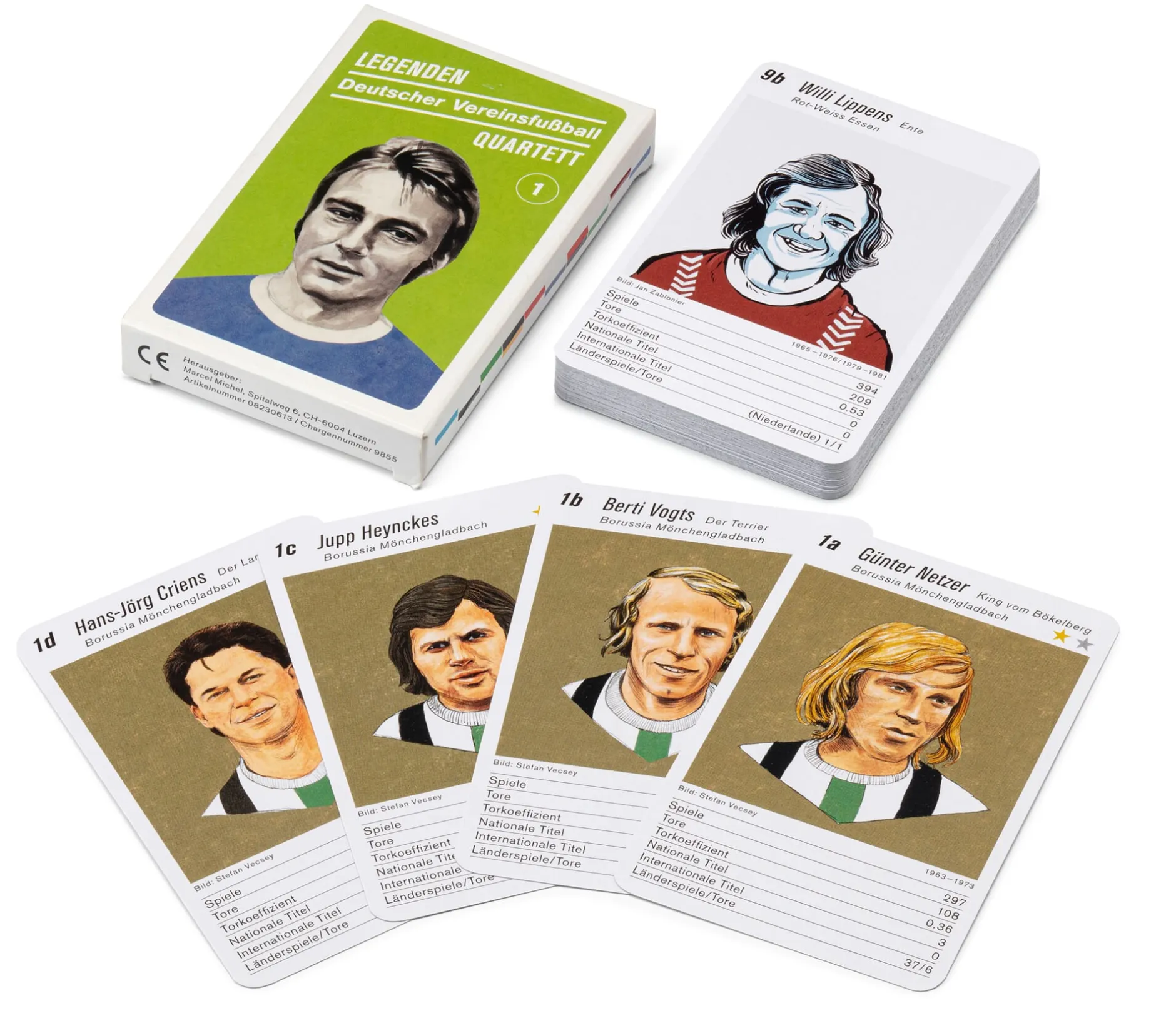 Für die deutschen Fußballlegenden führt dieses Quartettspiel die Anzahl ihrer Spiele in der 1. und 2. Bundesliga bzw. in der Oberliga an, außerdem die Anzahl der Tore für den Verein, dem der Spieler hier zugeordnet ist, seinen Torkoeffizienten, die Zahl seiner nationalen und internationalen Titel und schließlich die Anzahl seiner Länderspiele und darin erzielten Tore. Und schon spielt Fritz Walter mit frischem Elan selbst Dribbelkönig Pierre „Litti“ Littbarski aus – und wer weiß, vielleicht kann „Schweini“ den „Bomber der Nation“ doch noch stoppen.
