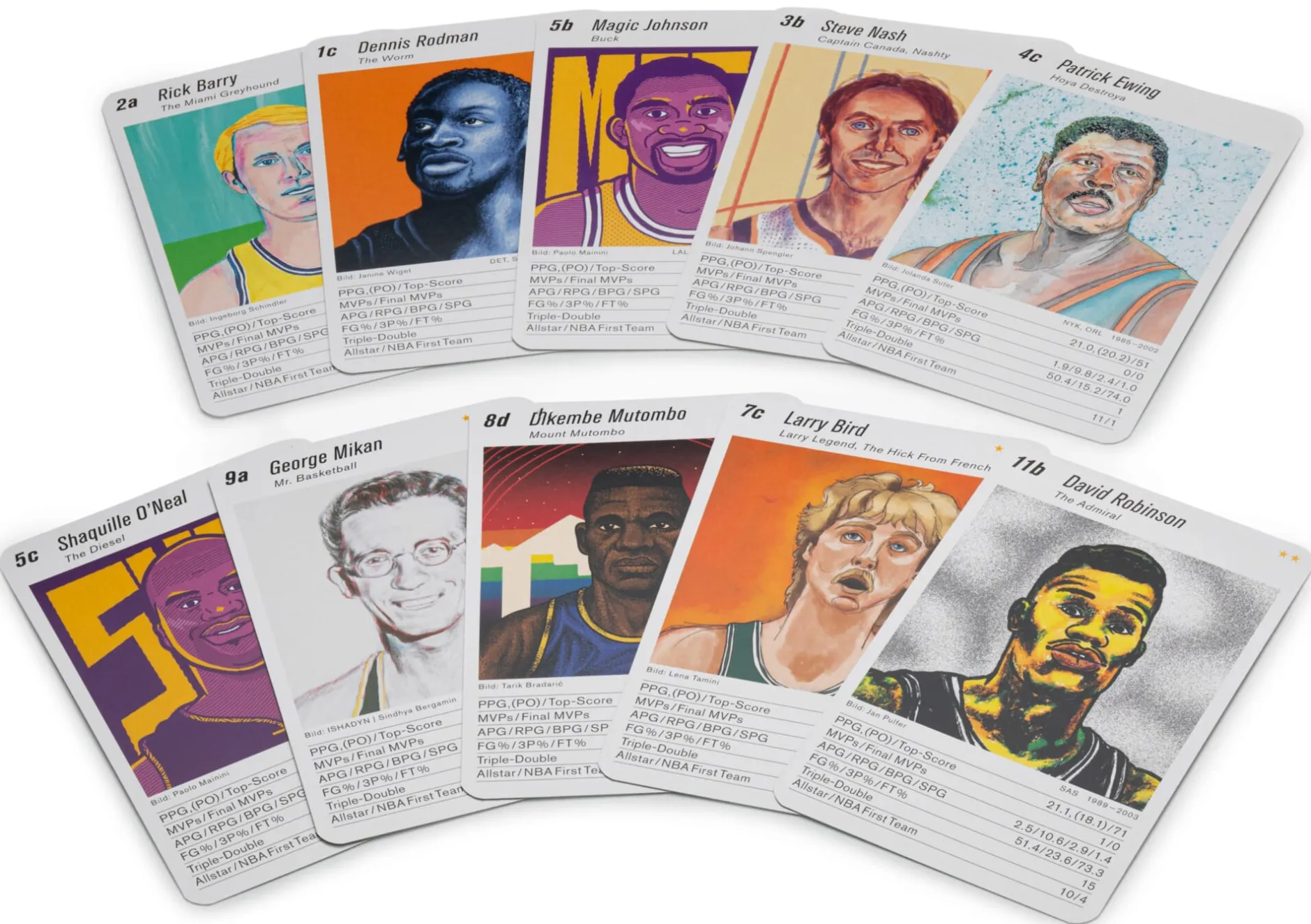 So herausragend die Leistungen der jeweiligen Sportlegenden, so ungewöhnlich sind auch ihre Konterfeis. Namhafte Künstler*innen aus der Schweiz und aus Deutschland zeichnen für die Illustrationen des Legenden-Quartetts verantwortlich. Zu jeweils zehn Teams à vier Mannschaftsmitglieder gruppiert, stellen die Karten nicht nur die Eigenheiten der Sportler*innen heraus. Vielmehr verdeutlichen sie in besonderer Weise, welch vielfältige Ansätze moderne Kunst zu bieten hat. Will meinen: Man kann mit den Karten nicht nur spielen. Man kann sie auch einfach genussvoll betrachten.