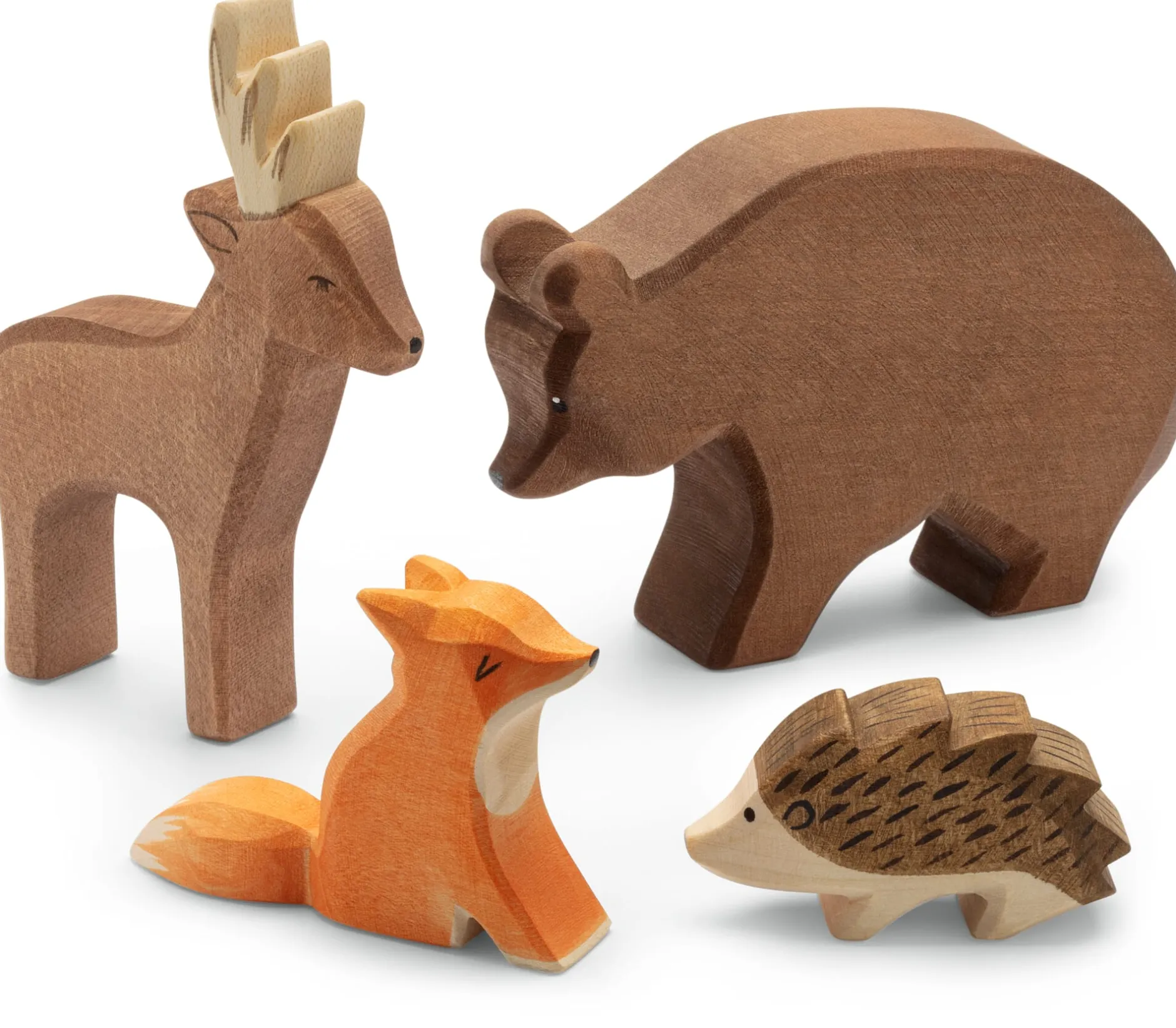Wer knistert und knackt da durchs Unterholz, was raschelt im Laub und wer schabt brummend an den Rinden der Bäume? (Nicht nur) Für Ihr Kind ist der Wald eine Welt voller faszinierender Lebewesen, die es zu entdecken und zu erforschen gilt. Ob Ihr Nachwuchs den letzten Ausflug nachspielen oder aber einfach seine Phantasie zwischen den Bäumen umherstreifen lassen möchte: Die reduzierte Gestaltung dieser Tierfiguren gibt der Phantasie Ihres Kindes freien Spielraum, und mit seiner feinporigen, glatt geschliffenen Oberfläche bietet das massive Ahornholz Ihrem Nachwuchs auch haptisch den Anreiz, Bär und Rehbock, Fuchs und Igel in die (be-)greifbaren Protagonisten spannender Begegnungen zu verwandeln. Seien Sie also darauf gefasst, dass fortan mit fröhlicher Kinderstimme der Wald auch auf dem Spielteppich zu immer wieder neuem Leben erwacht.