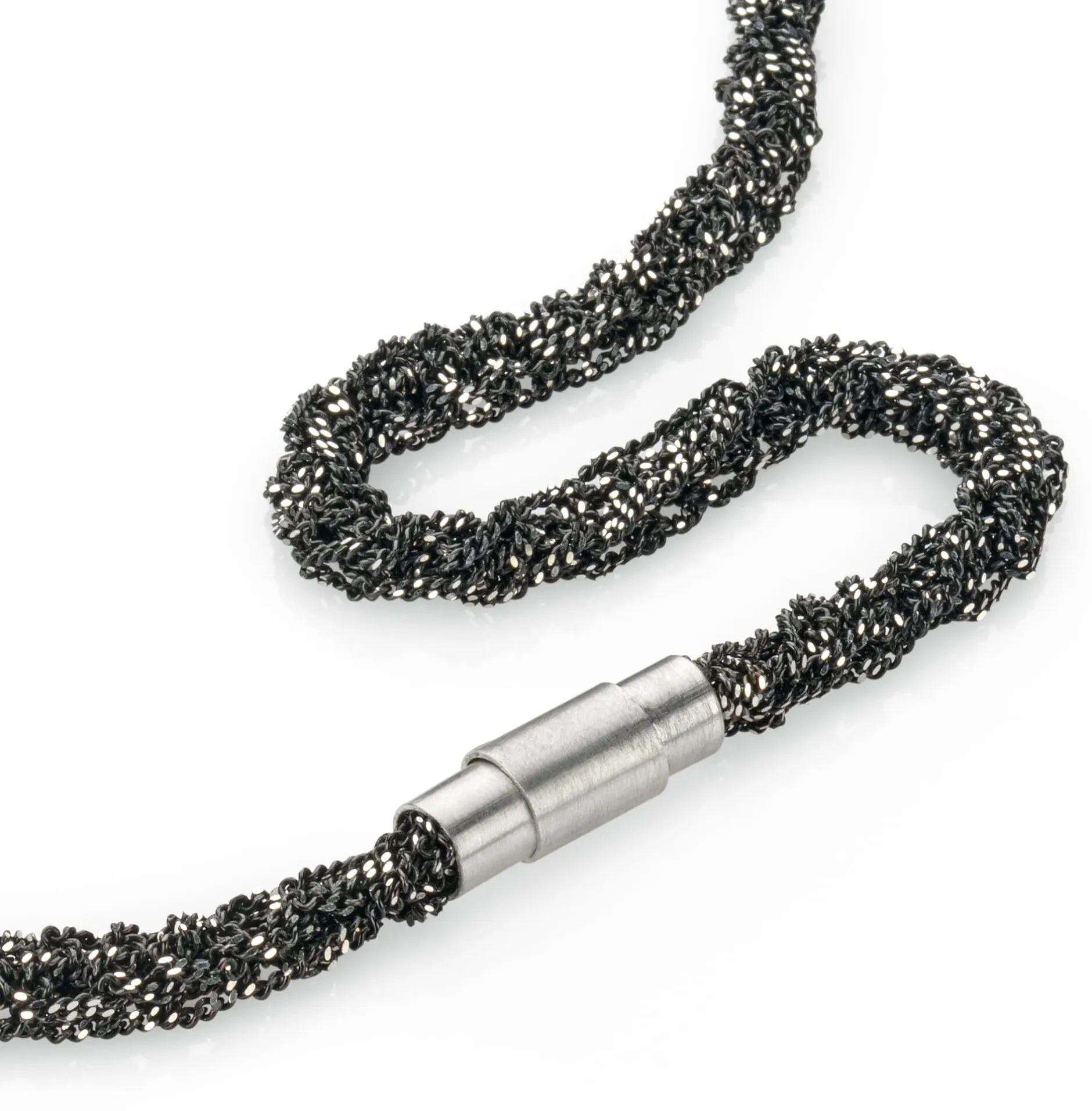 Feinen Silberdraht zu diesem gestrickten Collier zu verwandeln, verlangt Aufmerksamkeit und Fingerspitzengefühl: Zunächst wird er zu schmalen Ketten geflochten und oxidiert, um die insgesamt dunkle Optik zu erzielen. Anschließend werden die Ketten diamantiert – die winzigen Kettenglieder werden mittels diamantbesetzter Schleifwerkzeuge angeschliffen und poliert, bis sie das Licht reflektieren und für funkelnden Glanz sorgen, der eben nicht von eingesetzten Schmucksteinen sondern vom Silber selbst herrührt. Zu guter Letzt werden die schmalen Panzerketten zu einem Strang verbunden – in reiner Handarbeit. Verblüffend beim ersten Berühren: Das Collier schmiegt sich gut an die Haut an. Der klar gestaltete Magnetverschluss ist ebenfalls aus Silber gearbeitet, bei ihm ist es gebürstet. Übrigens: Mit dem passenden Armband können Sie das Collier bei Bedarf verlängern.