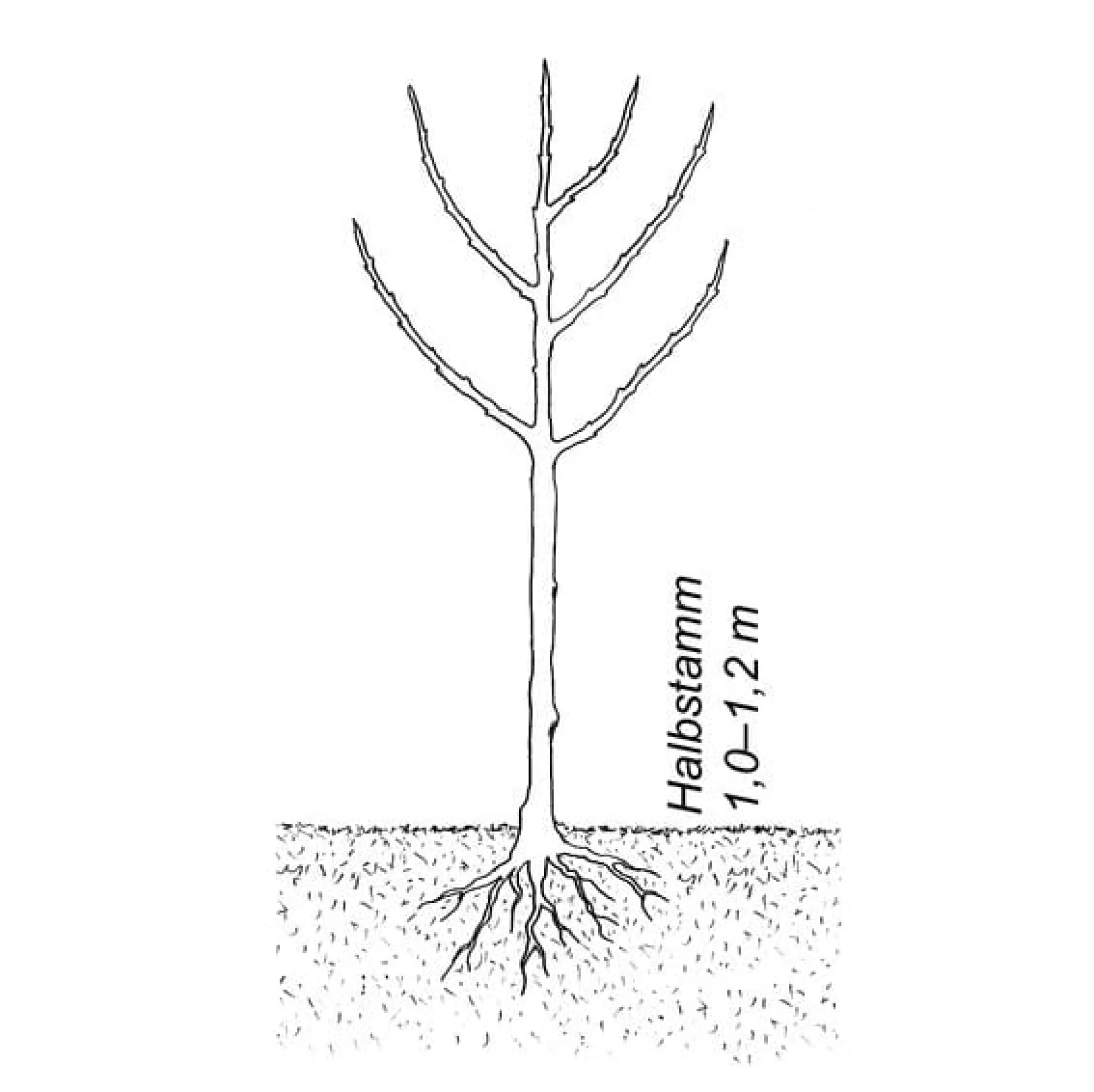 Halbstamm. Höhe bei Lieferung etwa 1,5 m. Die Stammlänge beträgt 1,1–1,3 m, die Gesamtlänge etwa 1,7 m (mit Wurzelwerk).
