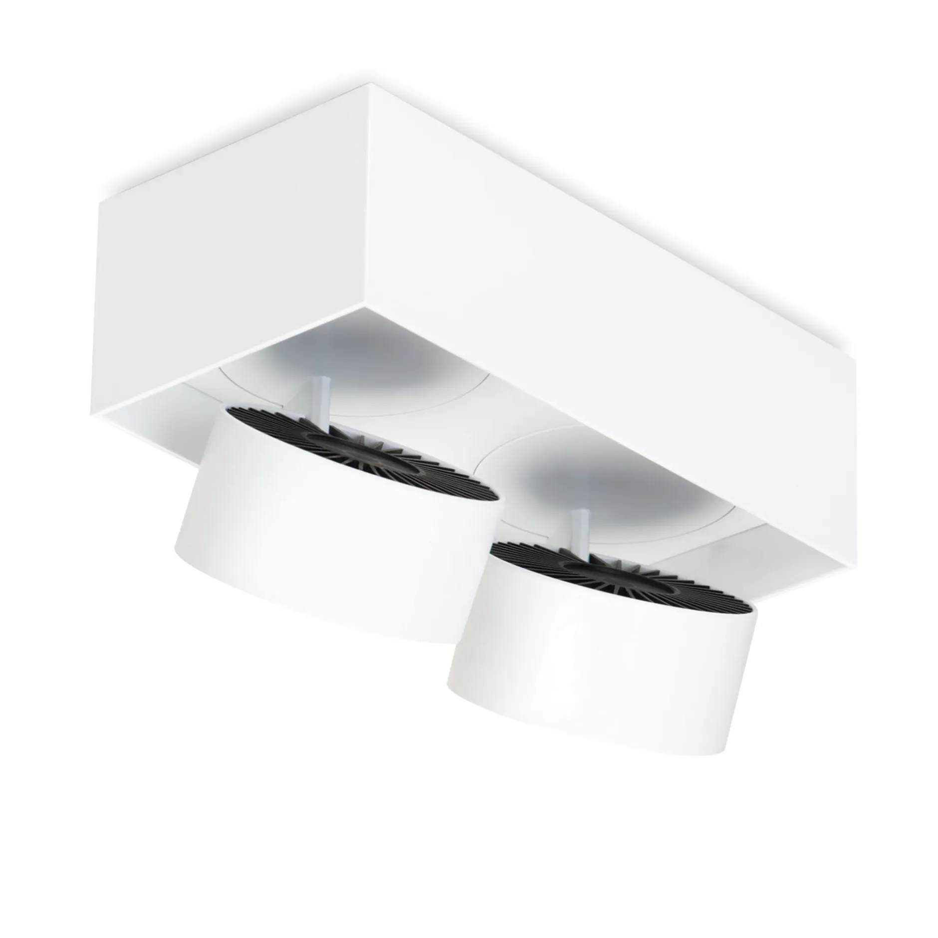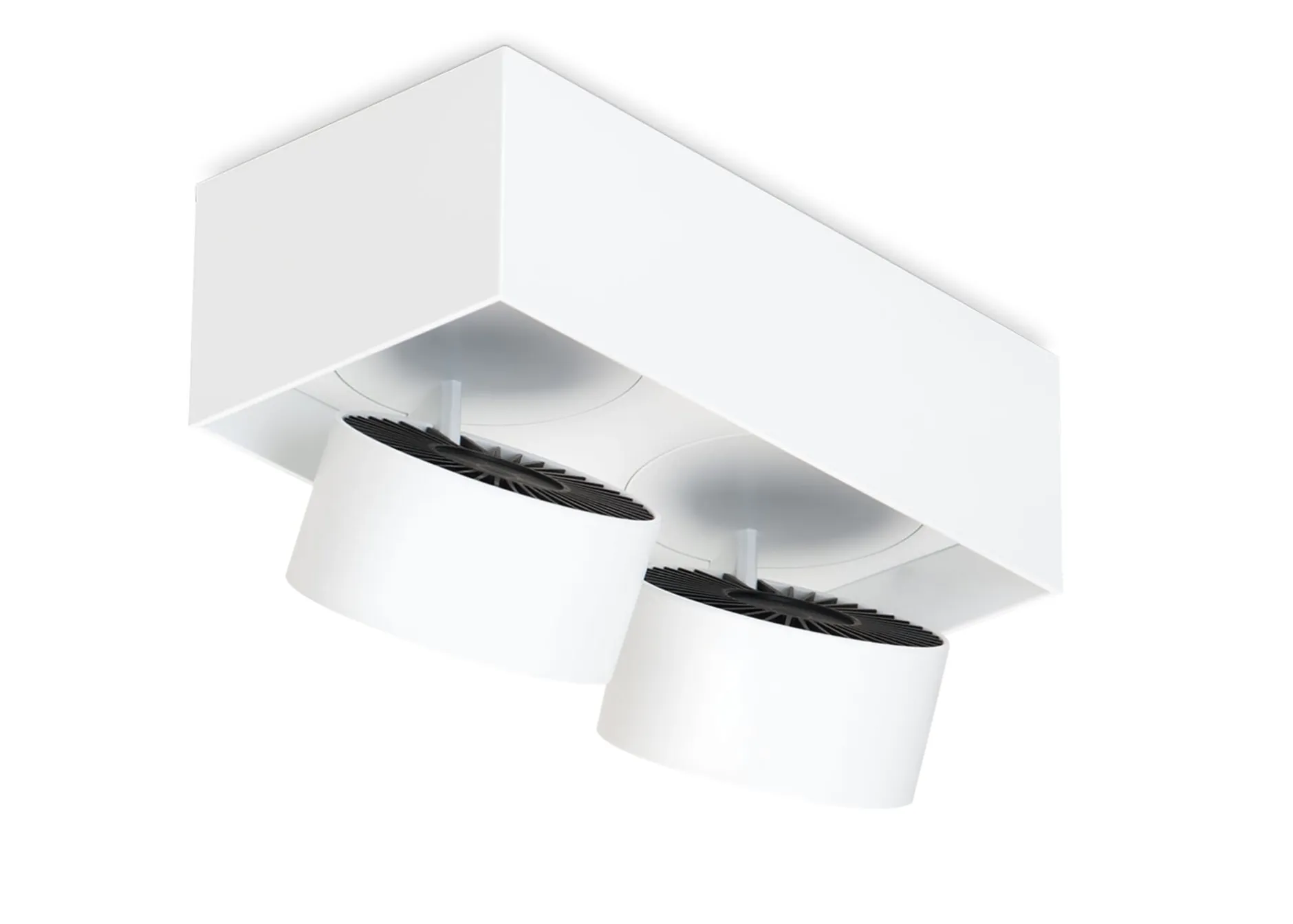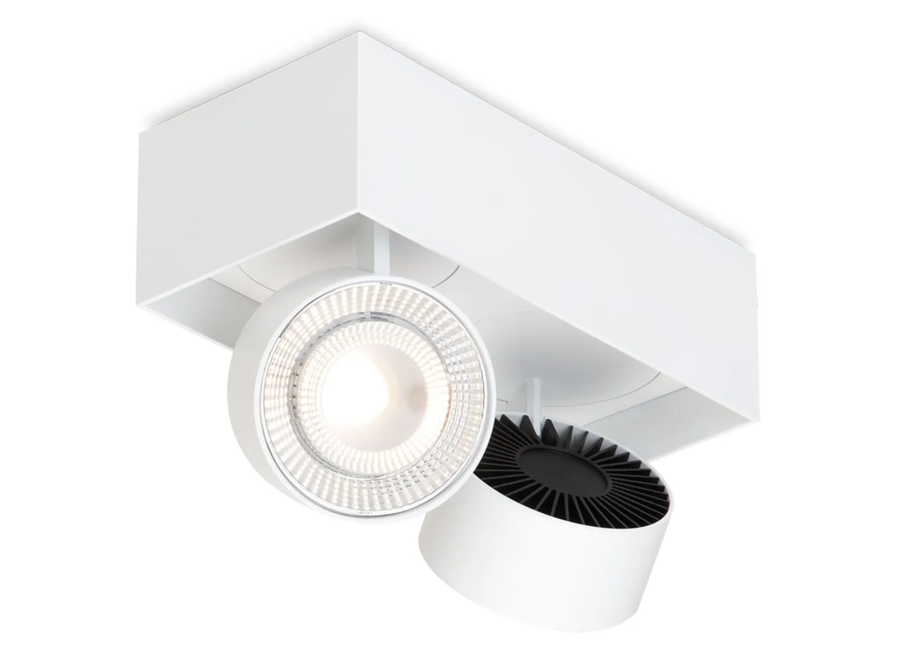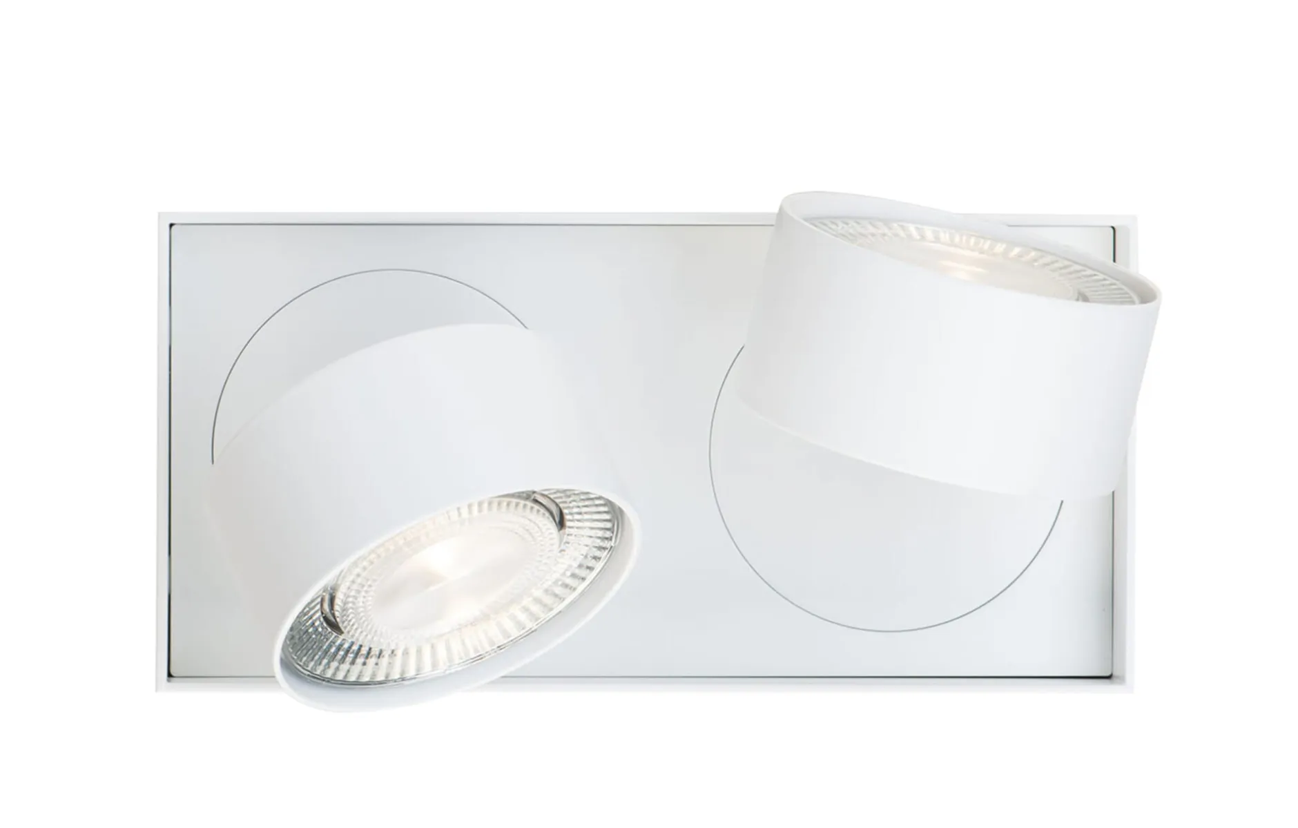 Hier in der Ausführung mit halbbündig in das rechteckige Gehäuse integrierten Leuchtenköpfen: vielseitig einsetzbarer Aufbaustrahler zur Akzentbeleuchtung. Die um 365 Grad drehbaren und 90 Grad zu schwenkenden Strahlerköpfe sitzen auf dem rechteckigen Gehäuse auf. Mit einem Griff lässt sich der gesamte Lichtkopf dank eines patentierten Bajonetts zur Wartung vom Gehäuse lösen. Aufwendiges Gehäuse, schön gefertigt, ohne sichtbare Schrauben und Kabel. Der Lichtaustrittswinkel der Leuchtmittel liegt bei 12 Grad und erzeugt damit ein punktuelles Licht. Im Lieferumfang enthalten sind zwei Aufsatzlinsen, deren Einsatz einen Lichtausfall von 38 Grad erzeugt und damit breit abstrahlt. Die Leuchte enthält LED-Lampen. Lichtstrom: 1.100 lm, Farbtemperatur: 2.700 K, Farbwiedergabe (CRI > 90), Nennleistung: 2 × 12,7 W.