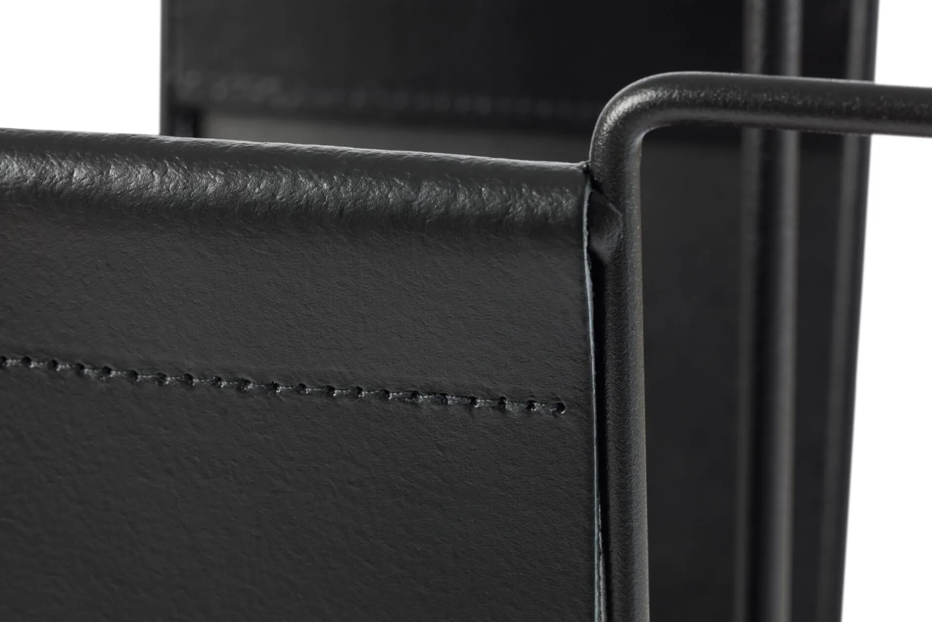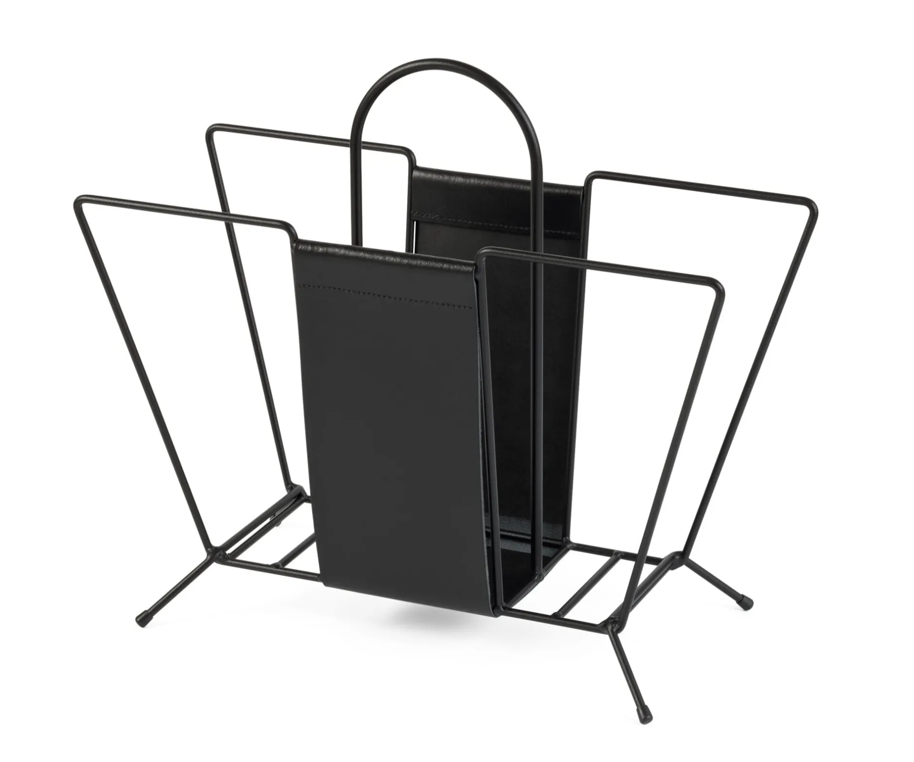 In der Mitte wird der Zeitungsständer durch einen hohen Bügel geteilt, der auch als Tragegriff dient. Aus Stahldraht, schwarz pulverbeschichtet. Mit einem Einsatz aus vegetabil gegerbtem braunem bzw. schwarz durchgefärbtem Vachettenleder. Füße mit Kunststoffkappen (LDPE). Höhe 32 cm, Breite 47 cm, Tiefe 21 cm. Gewicht 1,6 kg.