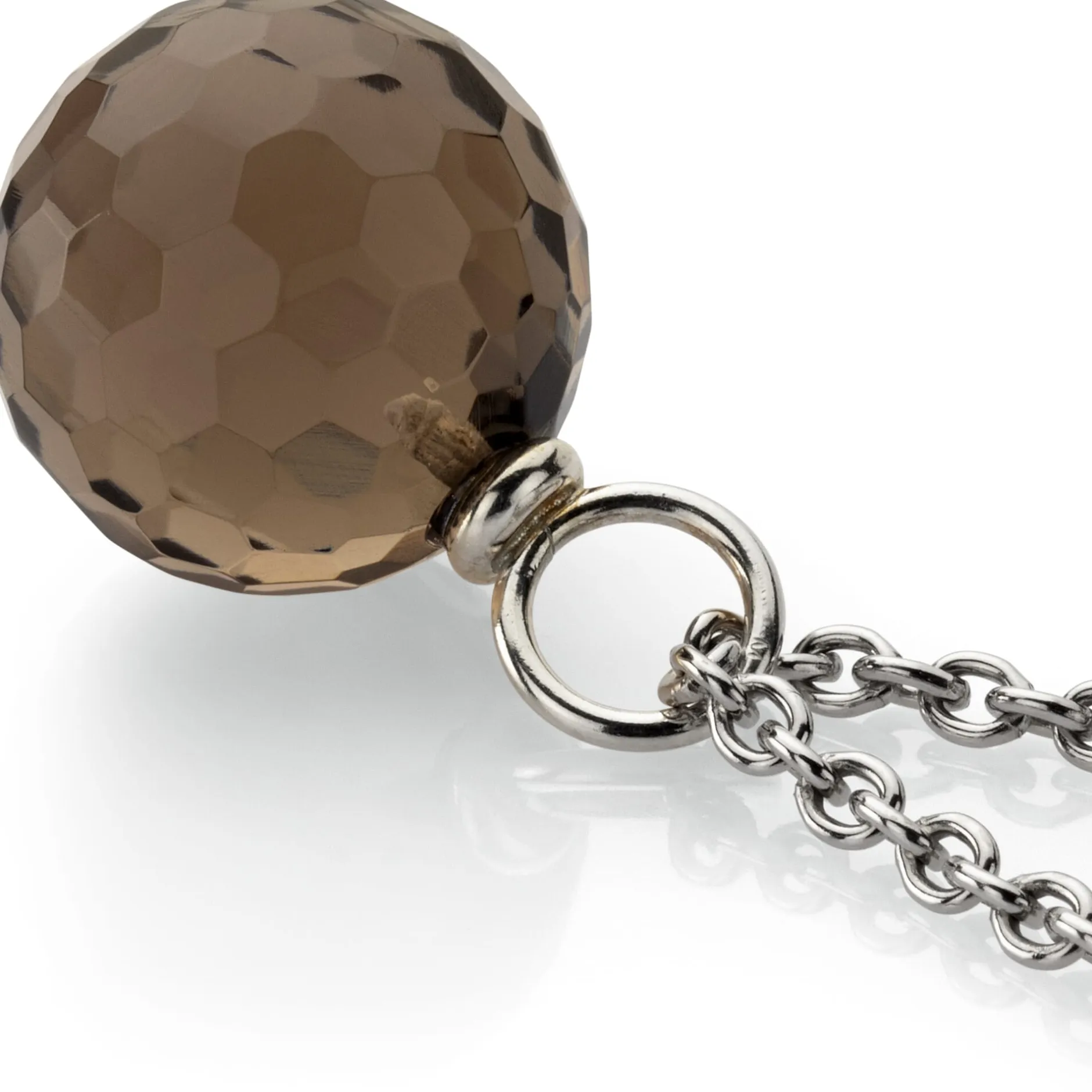 Den Anhänger dieser Kette fertigt Ménard aus einer Rauchquarzkugel mit Facettenschliff in Form kleiner Sechsecke. Je nach Lichteinfall zeigt er beim Tragen ein feines Glitzern. Die filigrane Ankerkette mit Karabinerhakenverschluss besteht aus 925er Silber.
