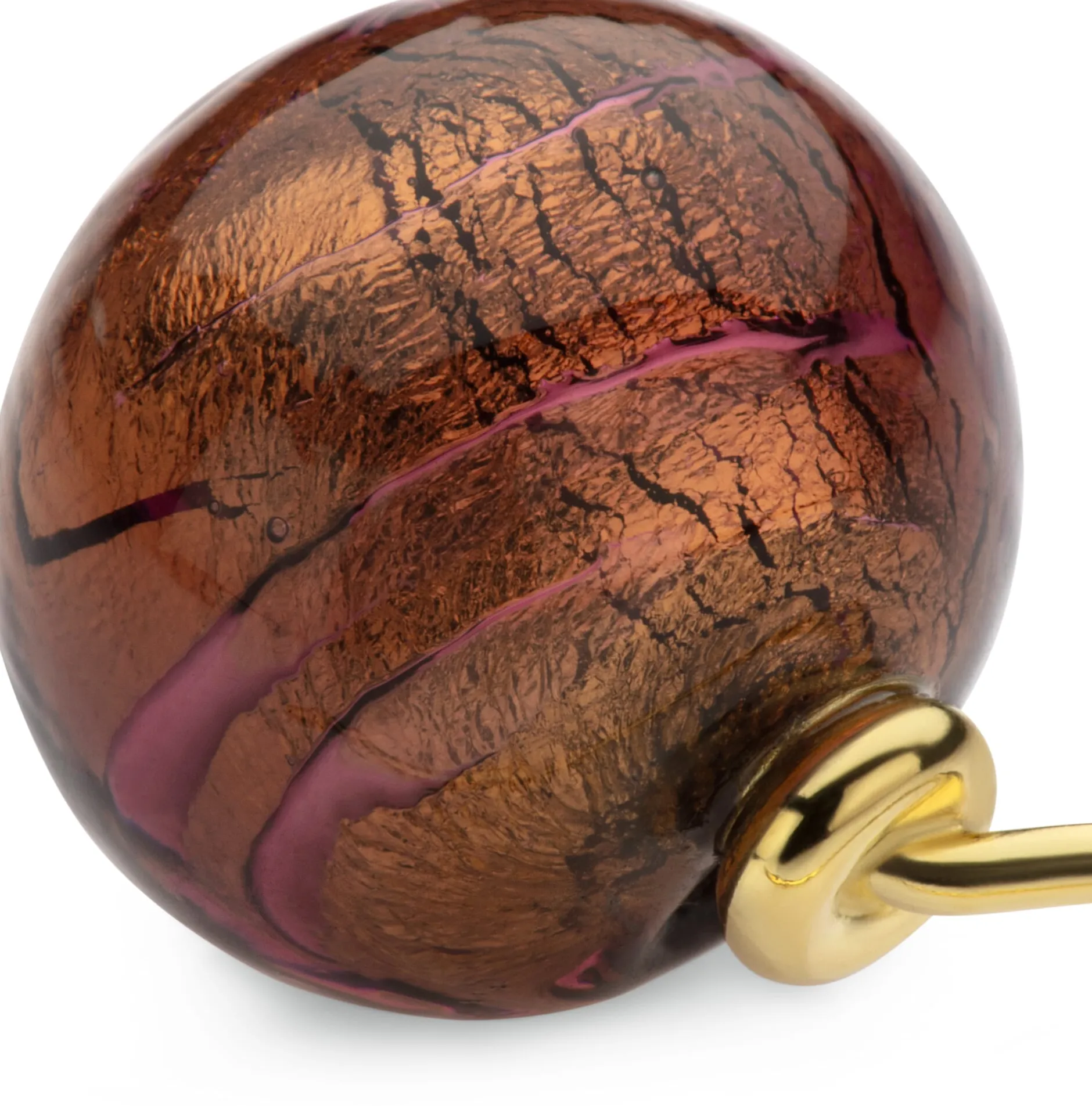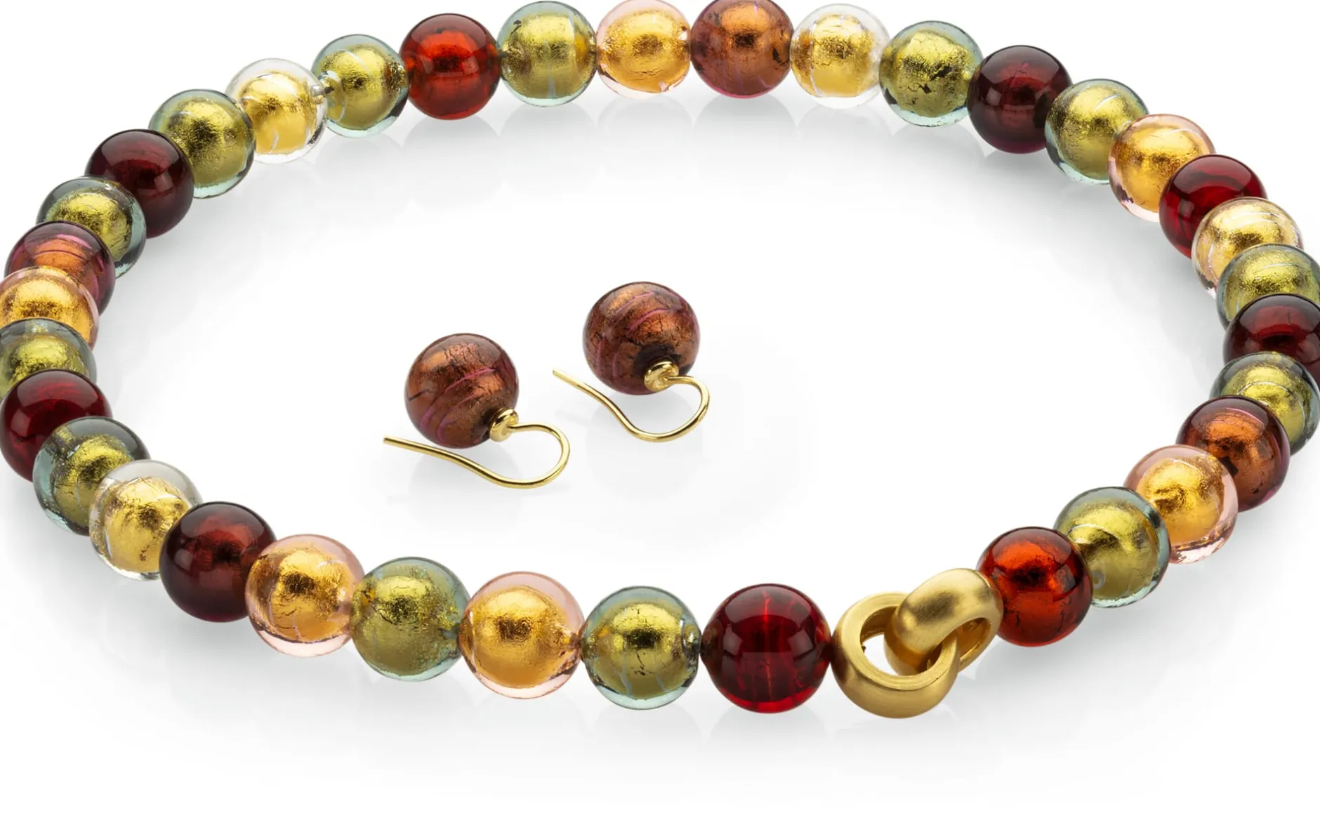 Auf der vor Venedig gelegenen Laguneninsel Murano entstehen in bester venezianischer Tradition die schillernd-farbigen Glasperlen, aus denen in einer Pforzheimer Schmuckwerkstatt diese Ohrhänger gefertigt werden. Die Perlen gewinnen ihre Form, Farbe und Schönheit je einzeln von Hand unter der Flamme. Das verarbeitete Glasmaterial ist dank eines besonders hohen Anteils an Aluminiumoxid überaus bruchfest – über diese Information hinaus geben die herstellenden Betriebe das Geheimnis der Zusammensetzung ihres Ausgangsmaterials und ihre Farbrezepturen nicht preis. Lediglich das Schillern können wir erklären: Über die von einem Glasstab abgetrennten Perlenrohkörper wird – als Untergrund für eine weitere farbige Glasschicht – eine Feingoldfolie gelegt, darüber schließlich eine weitere Schicht aus klarem bzw. farbigem Glas aufgetragen. Bei diesen Ohrhängern kommt jeweils eine Glasperle zum Einsatz. Der Silberbügel, der durch das Ohrloch geführt wird, ist zur besseren Verträglichkeit vergoldet.