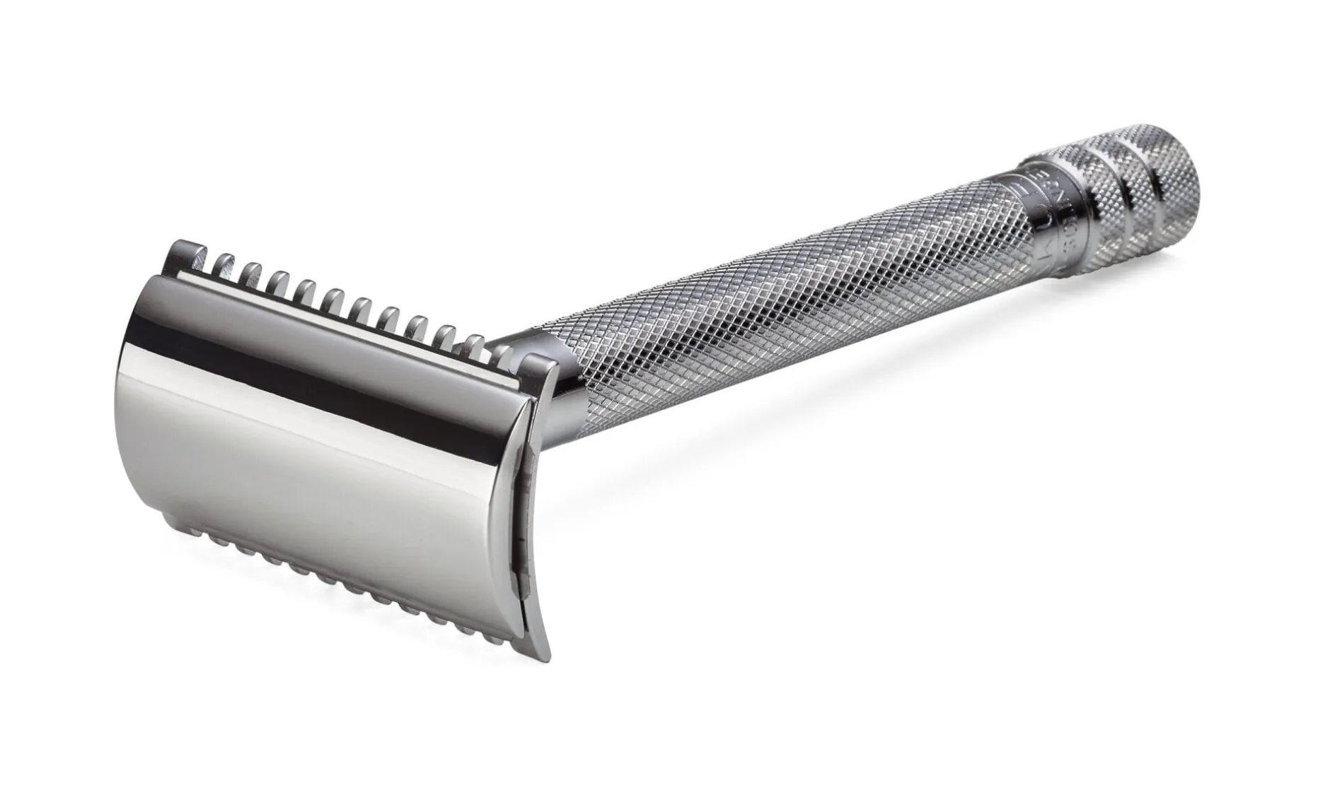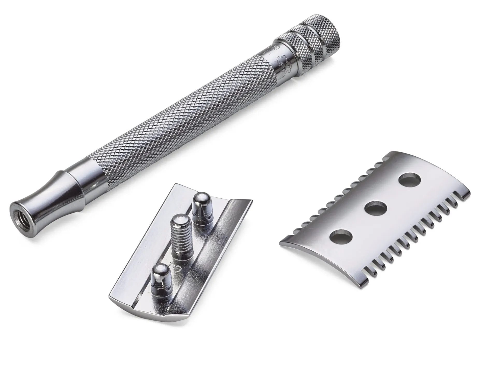 Ein Rasierhobel mit geradem Schnitt und Zahnkamm. Er eignet sich speziell für längere Bart und Körperhaare, daher auch gut für Damen zum Rasieren der Beine. Im Unterschied zu den klassischen Modellen von Merkur ist dieser Rasierer mit einem sehr langen Griff ausgestattet. Dadurch und aufgrund der Kreuzrändelung lässt er sich beispielsweise auch unter der Dusche sicher halten. Etwas Umsicht ist hier dennoch geboten, denn durch das Gewicht des Rasierkopfes und eventuelle Seifenreste am Griff neigt der Rasierer eher zum Rutschen, wenn er kopfüber gehalten wird.