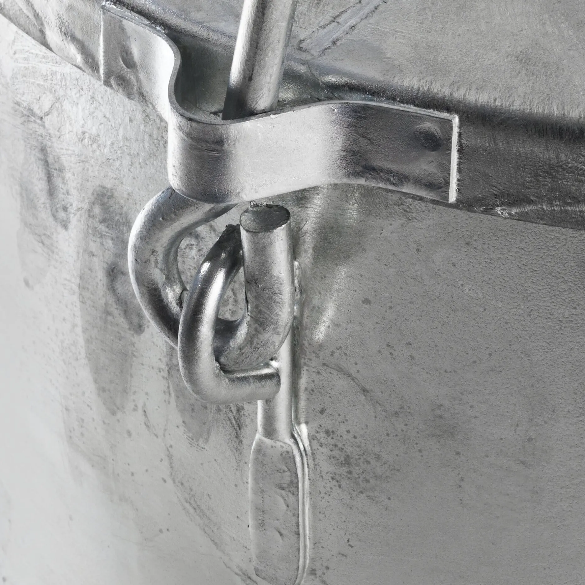 Ein aufwendig gefertigter, sicherheitsorientierter Ascheeimer mit Deckel, hergestellt in Westfalen. Die 11 Einzelteile werden in Handarbeit zusammengefügt und anschließend feuerverzinkt. Der Eimerboden ist vom Untergrund abgehoben, um bei noch warmer Asche einem Schwelen oder Entzünden vorzubeugen. Nach dem Einfüllen kann der Deckel geschlossen werden, was Ascheflug verhindert.