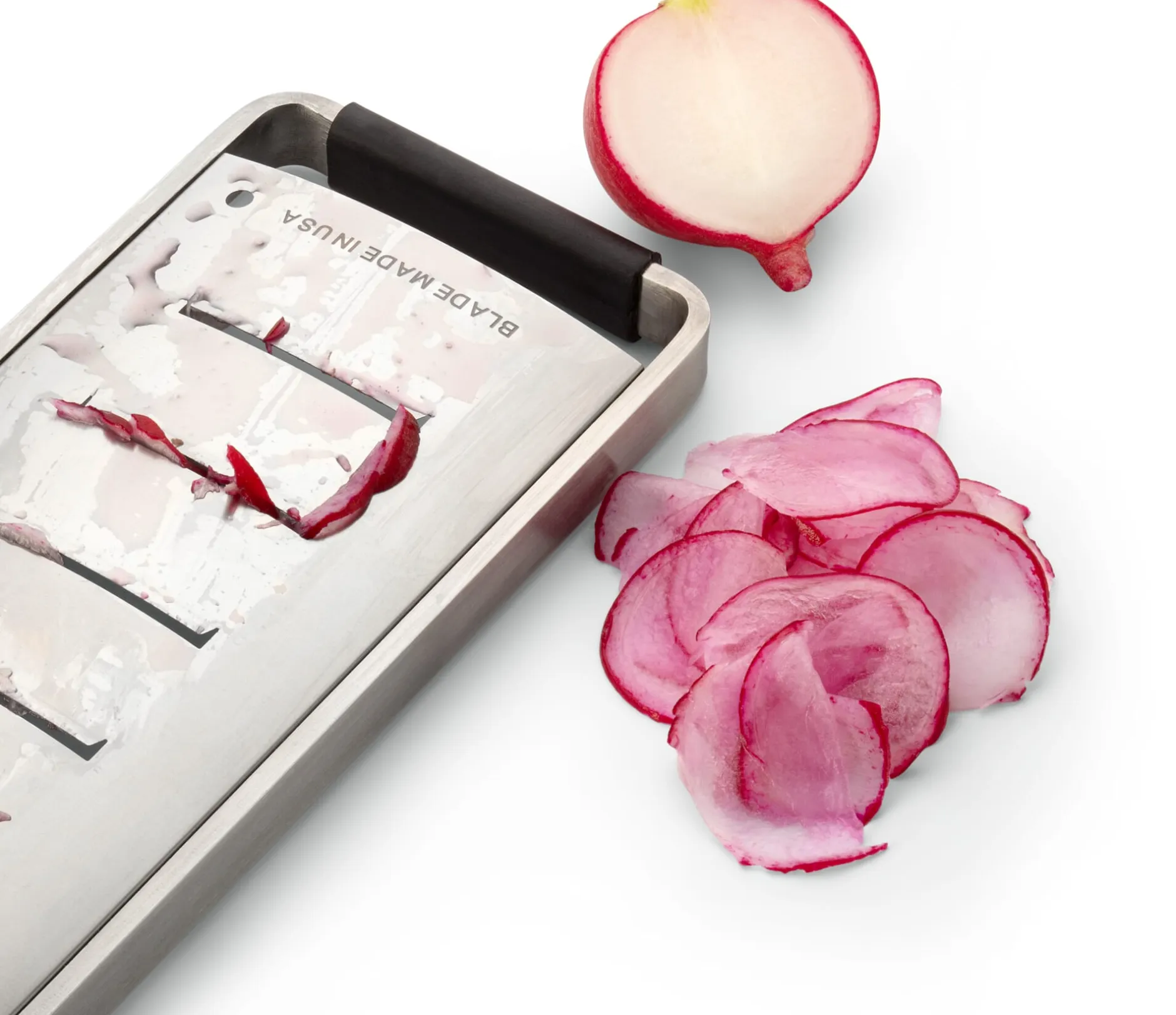 Diese Reiben sind rasiermesserscharf. Ihre vielen kleinen Klingen werden nicht einfach aus dem Material gestanzt, sondern ganz präzise fotogeätzt. Deshalb sind die Klingen so scharf – und bleiben das auch, denn selbst bei häufigem Gebrauch der Reiben nutzen sie sich kaum ab. Zitrusschalen zum Beispiel werden geschnitten, nicht zerrieben, und bewahren Geschmack, Aroma und Vitamine. Schokolade und Hartkäse lassen sich in feine Flocken hobeln, Kartoffeln und Gemüse behalten ihre Struktur.