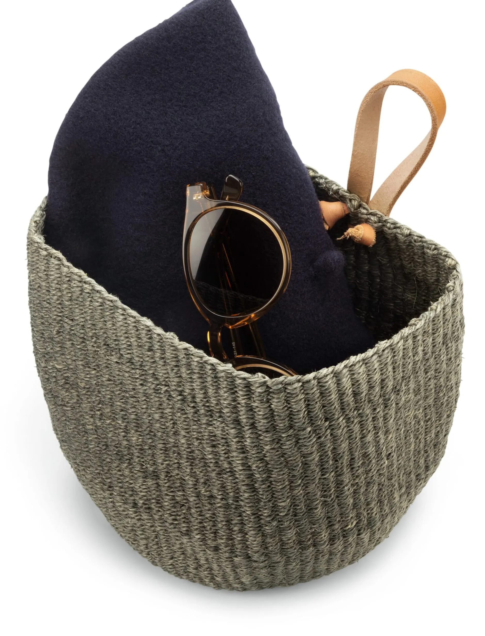 Korb aus Sisal, mit Schlaufe aus Rindleder, vegetabil gegerbt. Volumen ca. 2,8 l. Hergestellt in Kenia.