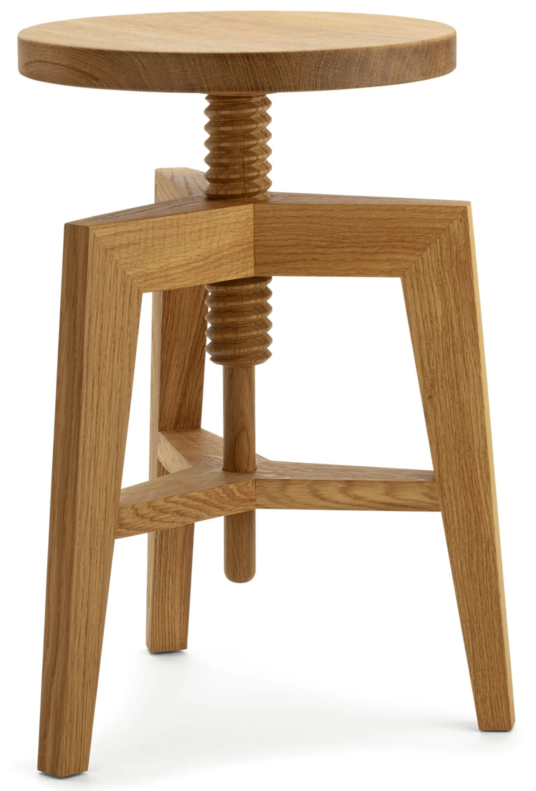 Von Haus aus, noch besser gesagt, von Werkstatt aus sind Spindelhocker Arbeitsmöbel, die einen exakt umrissenen Zweck erfüllen: mit flexibel einstellbarer Sitzhöhe Nutzer*innen Überblick bei der Arbeit zu verschaffen – an jedem Tisch, für jede Körpergröße. Die einfache, doch höchst funktionale technische Lösung für diese Anforderung ist die mechanische Höhenverstellung über eine Gewindespindel. Die formale Gestaltung eines solchen Hockers folgt ebenfalls allein diesem Zweck und beschränkt sich auf das Notwendige: das vom Dreibeinschemel inspirierte Gestell, eine Spindel, eine Sitzfläche – Minimalismus vom Feinsten. Wie aus dem ursprünglichen Werkstattmöbel ein eindrucksvolles, hochmodernes Wohnmöbel mit innenarchitektonischem Mehrwert werden kann, sehen wir an diesem Beispiel: Bis in sein zentrales Element hinein ist der Spindelhocker vollständig aus massivem heimischem Eichenholz gefertigt.