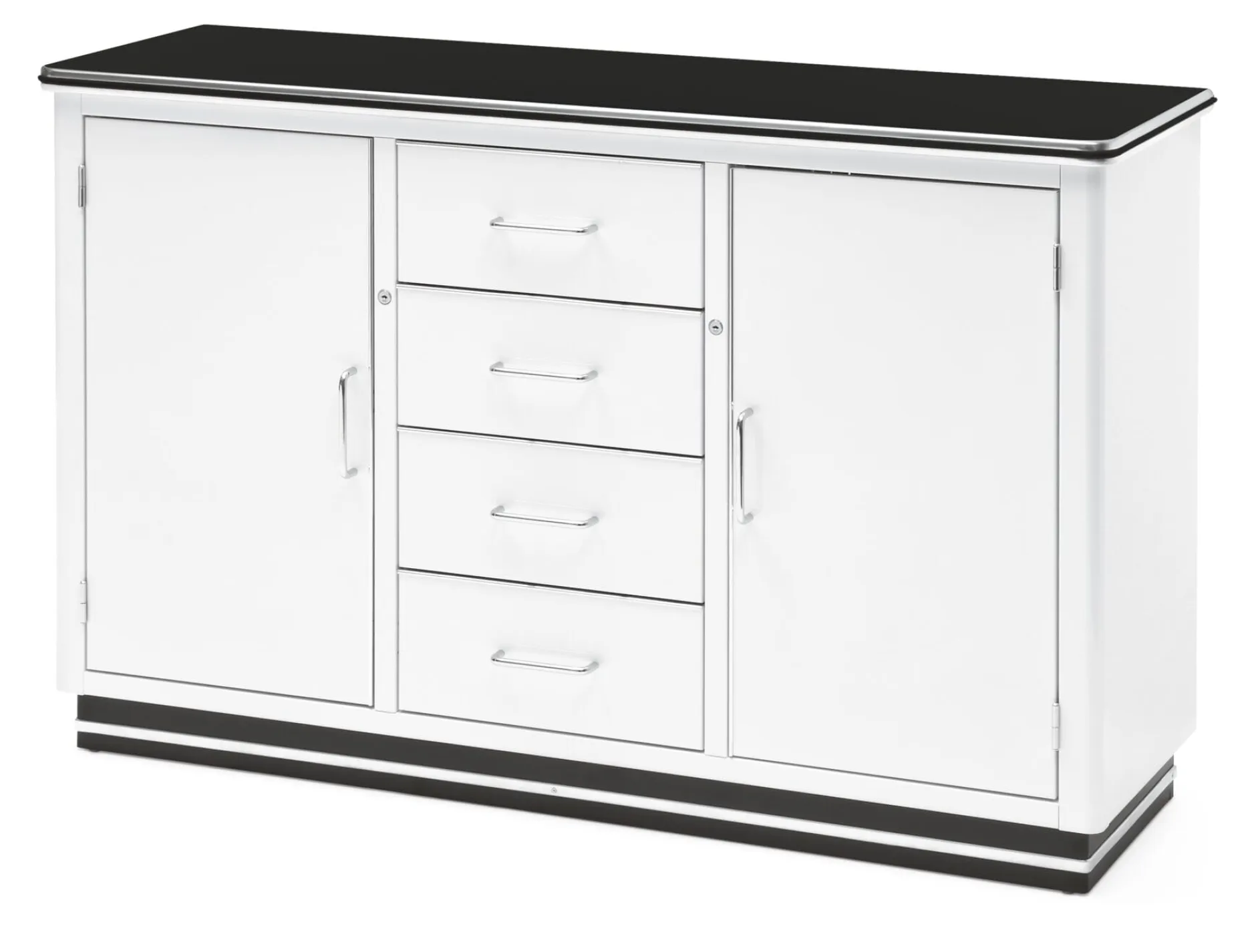 Auch diese „Sideboards“ erhalten Sie bei uns in einer Sonderausführung: Für die Deckplatte wird eine linoleumbelegte Tischlerplatte eingesetzt (anstelle kunststoffbeschichteter Spanplatte), und die Einlegeböden sind aus gekantetem, lackiertem Blech (anstelle kunststoffbeschichteter Spanplatte). Ausstattungsvarianten: zum Beispiel vier Schubladen statt einer Tür oder umgekehrt und zusätzliche Einlegeböden.