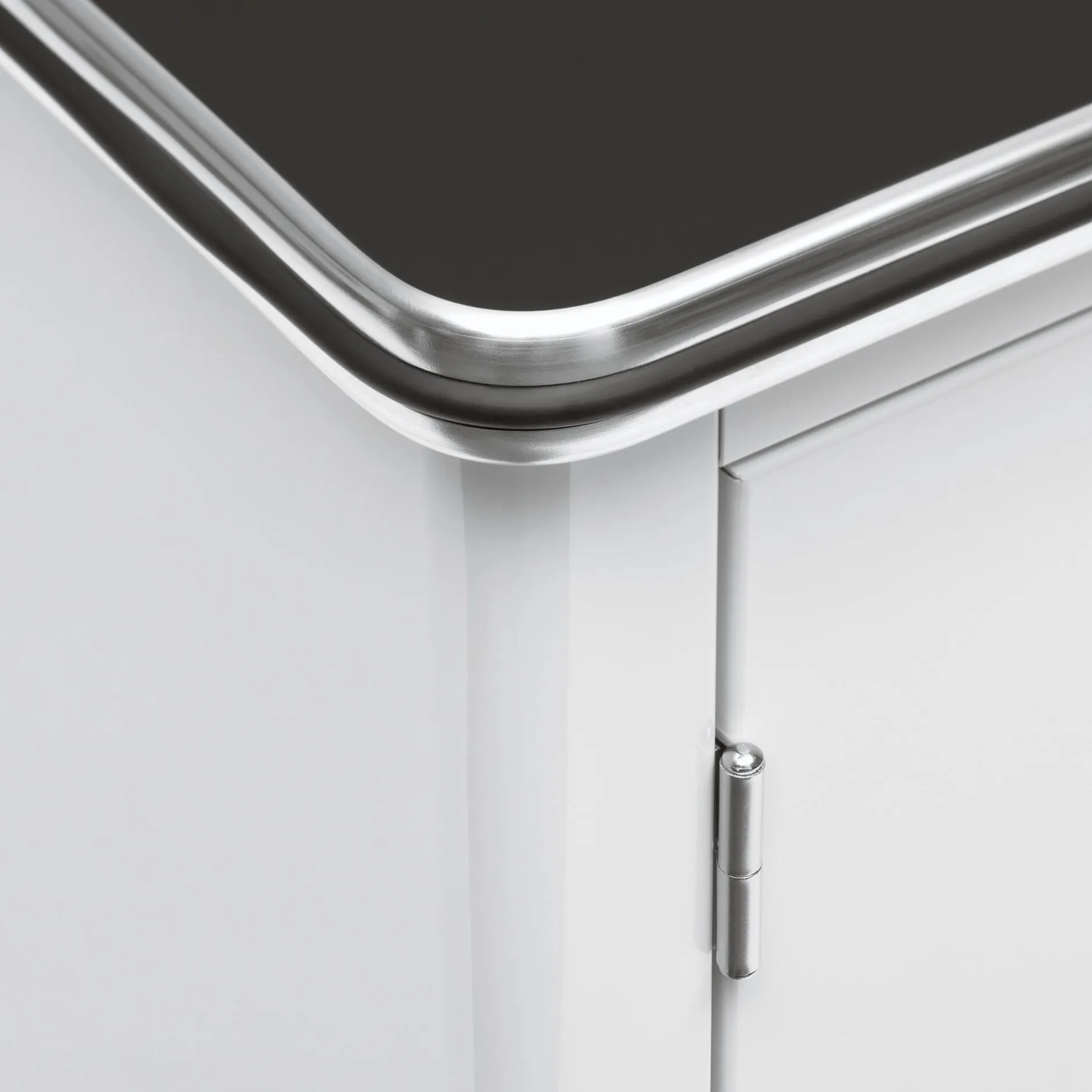 Schrank aus weiß (RAL 9003) lackiertem Stahlblech mit zwei abschließbaren Türen, Einlegeboden aus gekantetem, lackierten Blech, Kabeldurchlass in der Rückwand. Deckplatte Tischlerplatte mit Linoleumbelag in Schwarz.