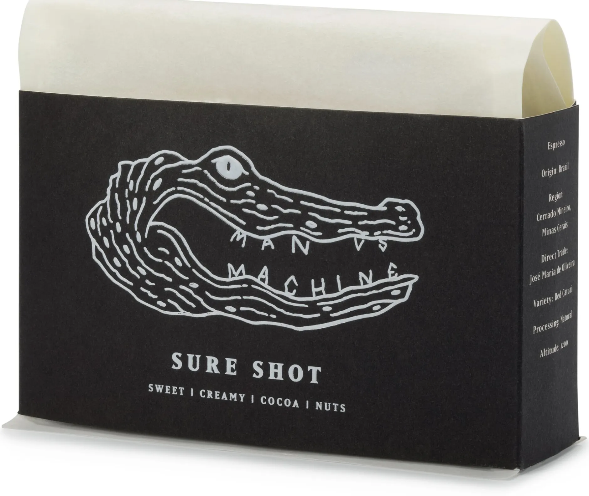 Die Bohnen für den Sure Shot stammen aus der Region Cerrado Mineiro im Südosten Brasiliens. Cerrado Mineiro liefert einige der besten Kaffees des Landes. Das liegt nicht zuletzt an den mineralreichen Böden und der Klimagunst: Die Temperaturen sind das ganze Jahr über relativ hoch, während die Niederschlagsmenge von November bis März am höchsten ist. Man versus Machine verwendet für den Sure Shot Kaffeebohnen der Sorte Red Catuai von der Farm von José Maria de Oliveira. Der Sure Shot zeichnet sich durch einen vollmundigen Geschmack, eine ausgewogene Säure und ein intensives Aroma aus. Dabei präsentiert er süße und cremige sowie schokoladige und nussige Geschmacksnoten.