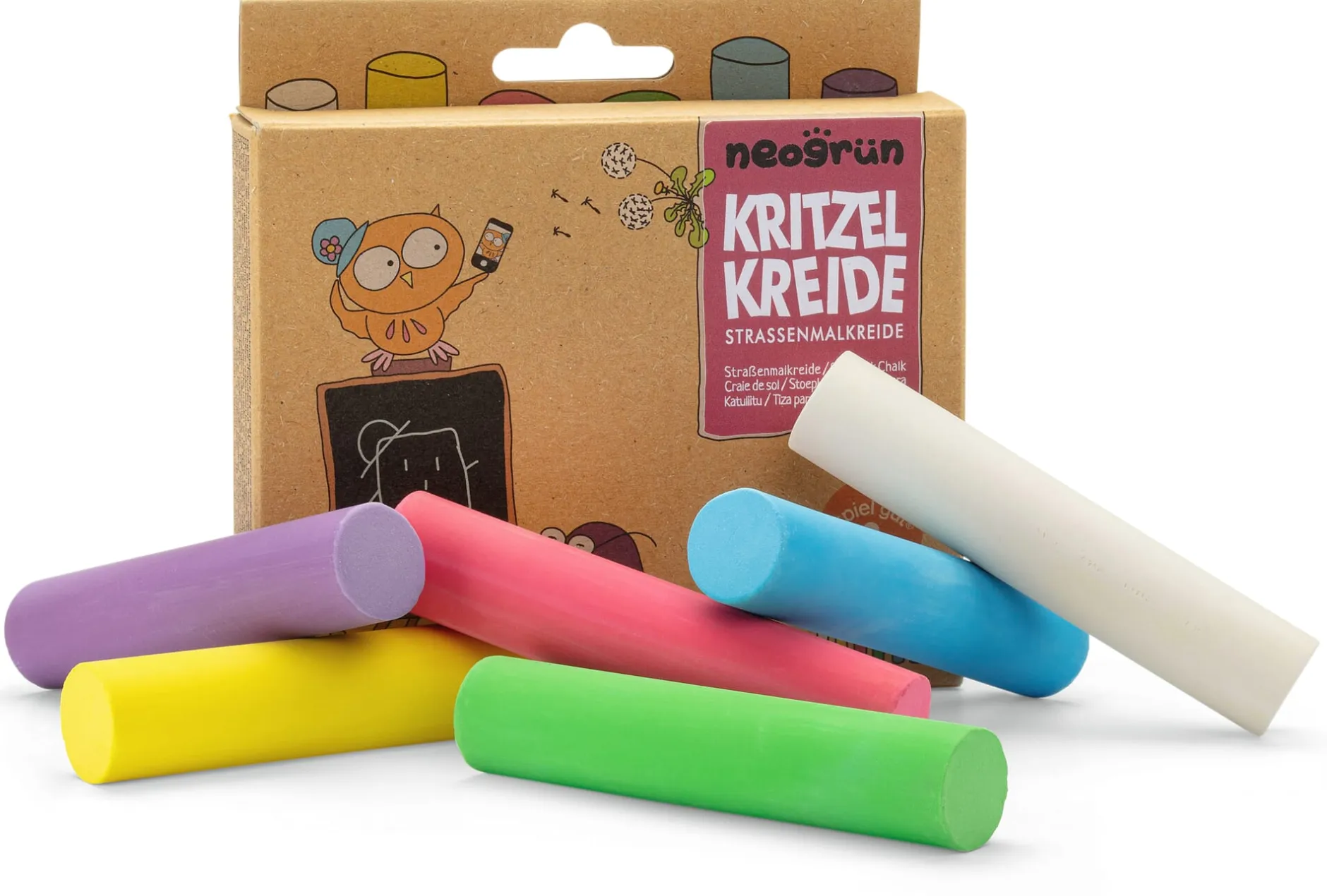 Ab 3 Jahre. 6 Kreidestücke (L 9,5 × Ø 2 cm) in den Farben Weiß, Gelb, Rot, Grün, Violett, Blau. Staubarm. In einem Karton von 12 × 12 × 2,3 cm. Gewicht 350 g.