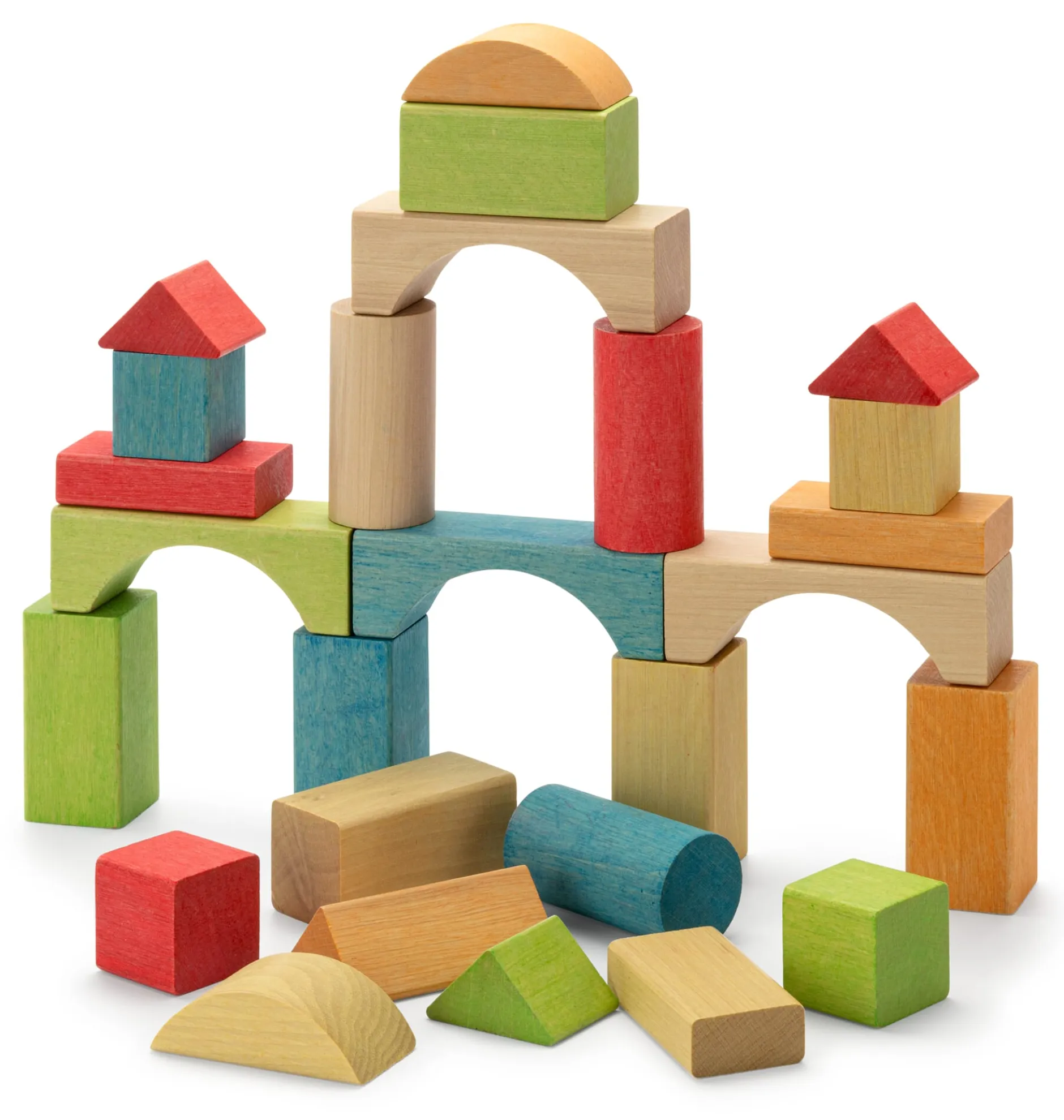 Holzbauklötze wie diese eröffnen Ihrem Nachwuchs tägliche neue Möglichkeiten, die eigene Kreativität zu erforschen und die sinnliche Wahrnehmung zu fördern. Sie bieten alles, was das Bauherr*innenherz sich wünschen kann: massives, geöltes Buchenholz, das sich samtig anfühlt und bei dem man beherzt zupacken kann. Eine aus pflanzlichen Pigmenten gewonnene, farbenfrohe Lasierung, die die natürliche Maserung des Holzes durchscheinen lässt. Und vor allem unterschiedlichste klare Formen, die sich immer wieder neu kombinieren lassen, die die Phantasie anregen und die Gestaltungskraft herausfordern.