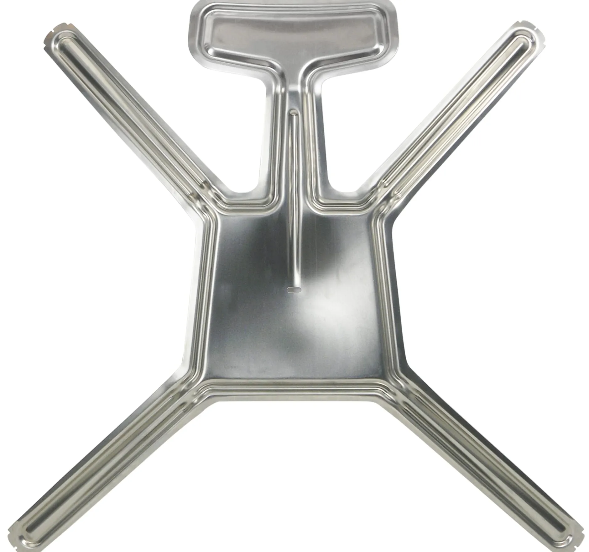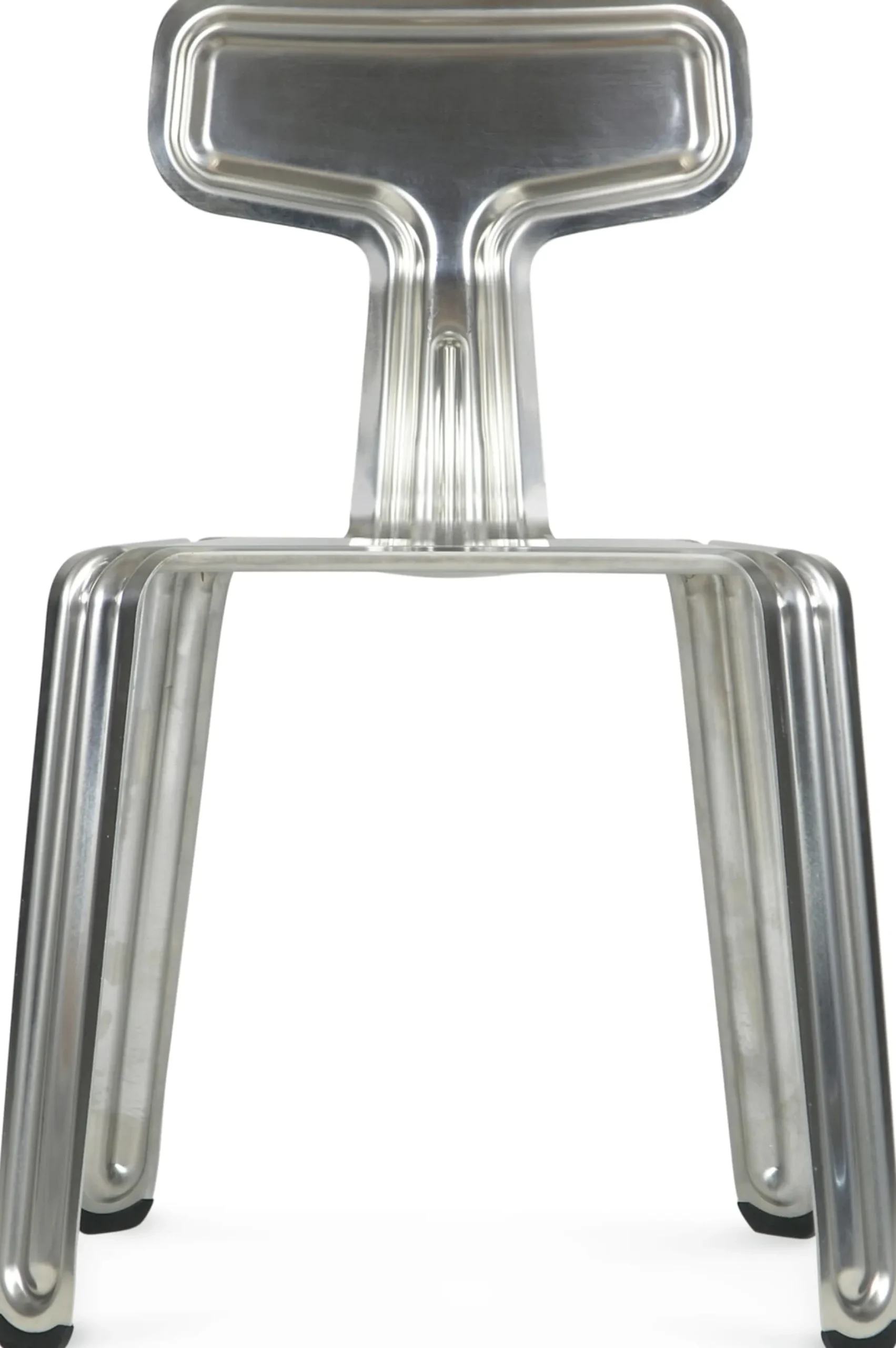 Reduziert auf das Maximum: Der PRESSED CHAIR ist ein Meisterwerk der Materialeffizienz. In einem einzigen Pressvorgang wird ein nur 2,5 mm dünnes Aluminiumblech in einen vollwertigen, tragfähigen Stuhl verwandelt. Seine Stabilität verdankt er präzise gesetzten, umlaufenden Vertiefungen und Wölbungen, die zugleich sein markantes Erscheinungsbild prägen.