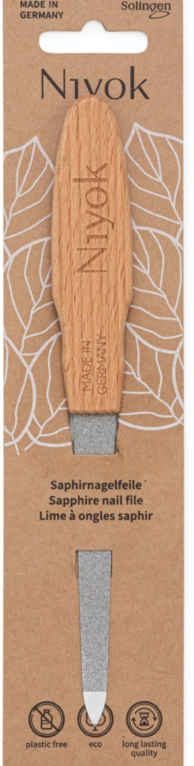 Feinstgekörnte Saphirminerale werden auf den Stahlrohling nicht nur aufgestreut, sondern in ihn verpresst und tief eingebettet. Sie brechen auch nach langer Zeit nicht aus, was nicht nur für eine längere Schärfe und Nutzungsdauer, sondern vor allem für eine bessere, nagelschonende Funktion sorgt. Die Saphirfeile trägt sehr fein ab und eignet sich deshalb vor allem zum Formfeilen. Praktisch ist hier das extra breite Blatt mit einer gröberen und einer feineren Seite und einer blanken Spitze zum Nagelreinigen. Dieses Exemplar gefällt uns aber auch sehr gut, weil es nach alter Machart mit einem eigenen Griff aus Buchenholz versehen ist (während den Billigfeilen ein eher wackliges Plastikhütchen maschinell übergestülpt wird). Er ist etwas größer als bei vielen anderen Feilen und ermöglicht eine leichtere Handhabung.