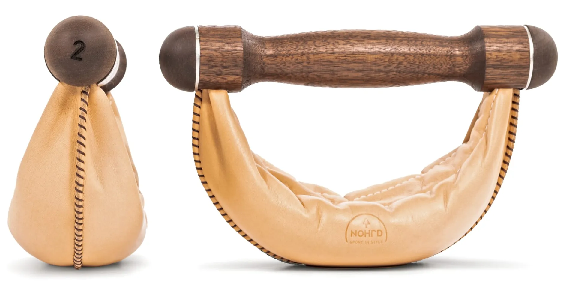 - Robust-griffig: Hanteln aus vegetabil gegerbtem Rindleder und Holz