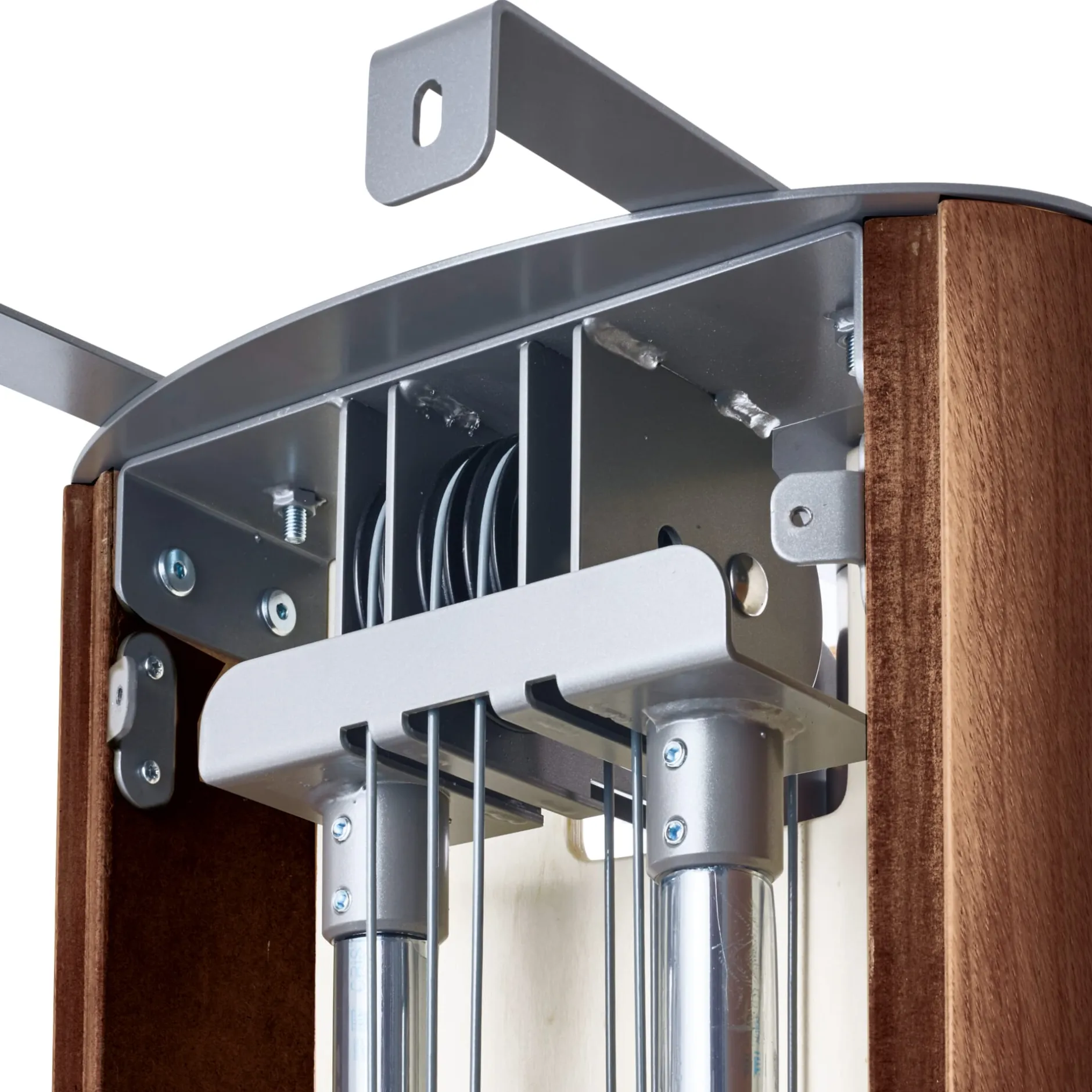 Auf den ersten Blick gibt sich der SlimBeam als Sportgerät kaum zu erkennen. Das stabile Seilzugsystem steht auf einer runden Bodenplatte mit lediglich 45 cm Durchmesser; verborgen wird es von einem schlanken Holzkorpus mit Echtholzfurnier, wahlweise aus Eichen-, Eschen- oder Nussbaumholz. Die Oberfläche, auch die der Holzgriffe, ist mit Hartöl behandelt, das zugleich gegen Feuchtigkeit schützt. Der Großteil der Bauteile ist aus pulverbeschichtetem Stahl oder Edelstahl gefertigt und ebenfalls unempfindlich gegen Feuchtigkeit.