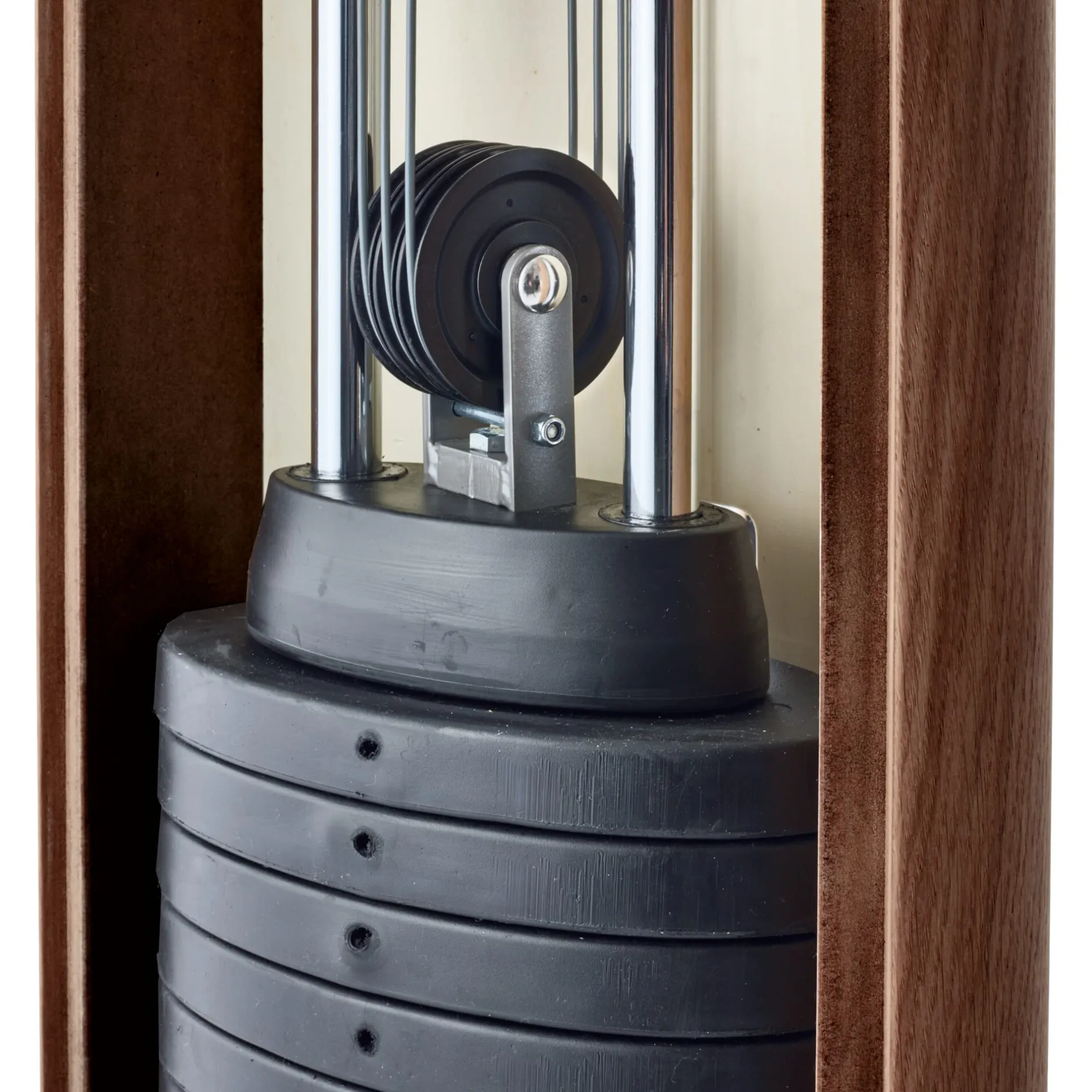 Bodenplatte Holz, Ø 44 cm. Korpus MDF-Sperrholz-Rahmen mit Echtholzfurnier, mit Hartöl behandelt. Höhe 2,15 m, Breite 40 cm, Tiefe 20 cm. Wandabstand 10 cm. Seil aus Stahl, mit Kunststoff ummantelt. Führungsstange, Halterungen, Adapter und Schmetterling aus Edelstahl. Flügelschrauben aus Kunststoff. 14 Gewichtplatten und ein Führungsgewicht à 5 kg. Zuggriffe aus Hanfseil. Übersetzung 3:1, max. Trainingsgewicht 25 kg. Klimmzugstange Holz, mit Hartöl behandelt. Halterung aus Edelstahl und Kunststoff. Breite 55 cm, Ø 3,5 cm. Gewicht 1 kg, belastbar bis 100kg. Gesamtgewicht ca. 120 kg.