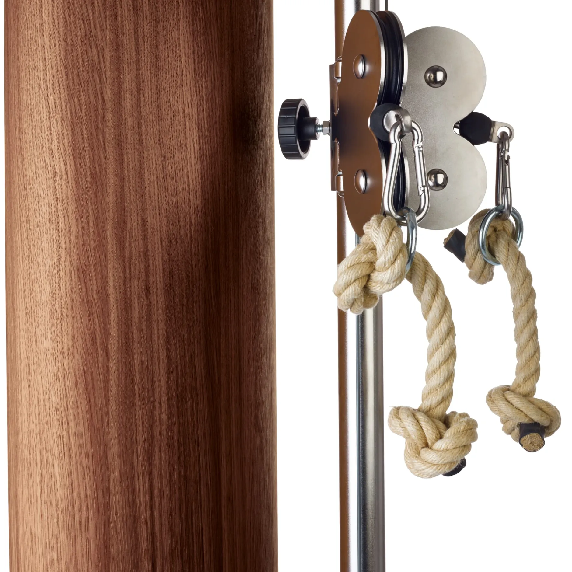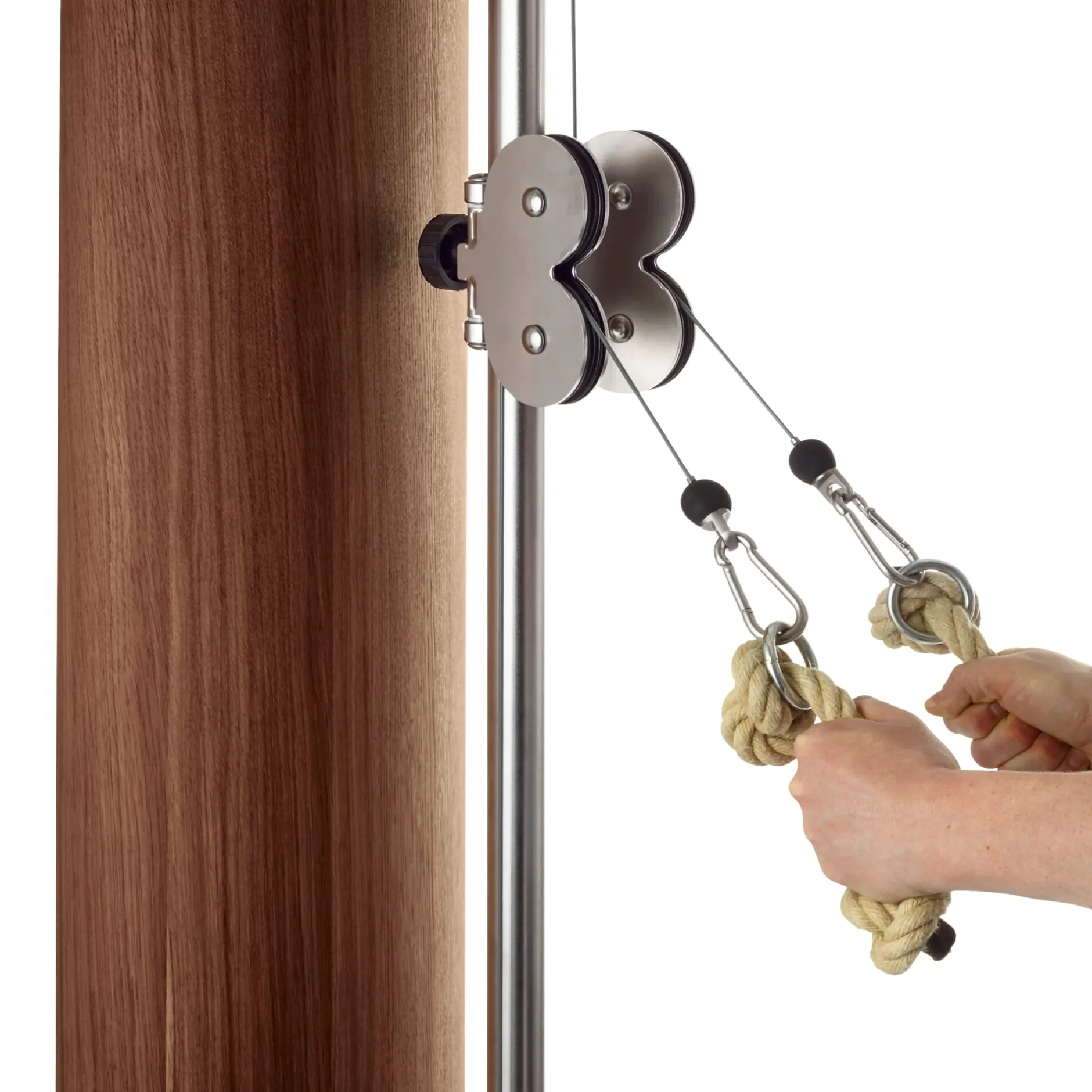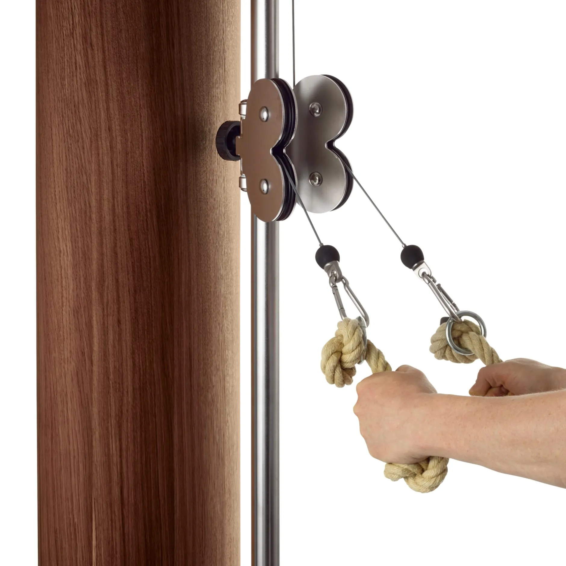 Die Anzahl der Gewichte wird wie üblich über einen Metallstift ausgewählt, der magnetisiert ist, sodass er zusätzlichen Halt in den Gewichten findet. Anders als bei handelsüblichen Geräten kann der Schmetterling mittels gummierter Flügelschrauben stufenlos in der Höhe verstellt werden. In Kombination mit den insgesamt 15 Gewichtplatten ermöglicht dies eine sehr feine, harmonische Gewichtsabstufung und damit ein differenziertes, individuell abgestimmtes Training. Gezogen wird über angenehm zu greifende, dicke Hanfseile. Mit ein paar Handgriffen und dem passenden Zubehör können Sie den SlimBeam leicht aufrüsten: Kugelgelagerte Griffe aus Holz, eine Fußlasche, eine Latzug-Stange aus Aluminium oder eine zweite Klimmzugstange sind separat erhältlich. Kontaktieren Sie dazu einfach unser Kundenzentrum.