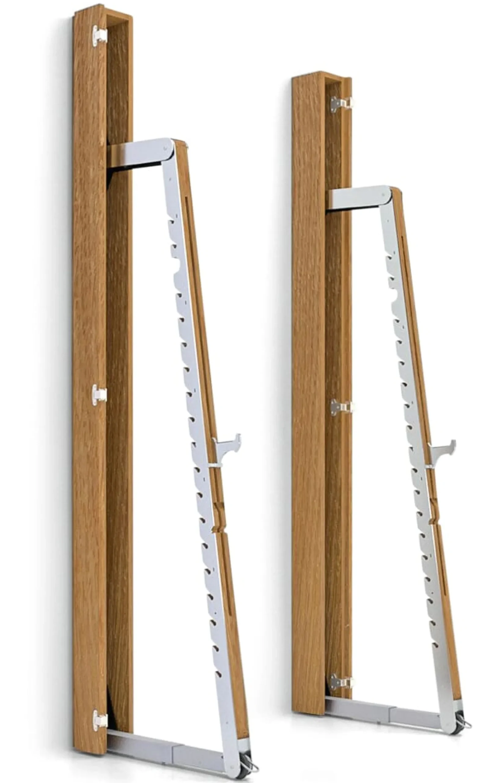 Wie bei allen Geräten von Nohrd ist beim SquatRack Holz das Material der Wahl, die Kombination mit Edelstahl erhöht nicht nur die Stabilität und Belastbarkeit, sondern setzt auch optisch Akzente. Zwei unscheinbare, schlanke Holzsäulen verbergen zunächst die Halterungen für die Langhanteln. Erst wenn Sie Ihr Training beginnen, werden sie über einen klug konstruierten, leichtgängigen (und patentierten) Mechanismus ausgeklappt und auf bodenschonenden Rollen per Fußmechanismus herausgezogen. Schon steht ein stabiles, funktionales SquatRack bereit, das Ihre Langhantel auf höhenverstellbaren Ablagen aufnimmt. Diese sind bis zu 200 kg belastbar, Kunststoffschienen schonen die Hantel und sorgen dafür, dass sie leise abgelegt werden kann. Die Ablagen lassen sich mit einem Handgriff leicht in der Höhe verstellen: 18 Höhen im Abstand von etwa zehn Zentimetern stehen zur Verfügung. So können Sie das Gewicht in verschiedenen Ausgangspositionen stemmen, in Rückenlage auf der Hantelbank für das Bankdrücken oder im Stand für das Squat-Training (formerly known as Kniebeugen). Nach Ihrem Workout klappen Sie das Rack einfach wieder ein und schieben es zurück in den Holzrahmen, worin es komplett verschwindet. Zu sehen sind dann lediglich noch zwei ranke Holzobjekte an der Wand, hier haben Sie die Wahl zwischen Eichen-, Kirsch- oder Walnussholz – passend zu Ihrer Einrichtung oder anderen Nohrd Sportgeräten. Komplettieren können Sie sowohl das Gerät als auch Ihr Training mit dem separat bestellbaren Hantelturm WeightPlate Tower. Stangen und Gewichte hat Nohrd in Zusammenarbeit mit der norwegischen Firma Gungnir entwickelt, mit deren patentiertem SlideLock™-System alle Hantelstangen versehen sind.
