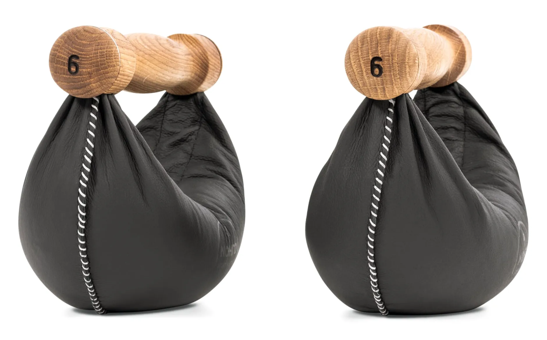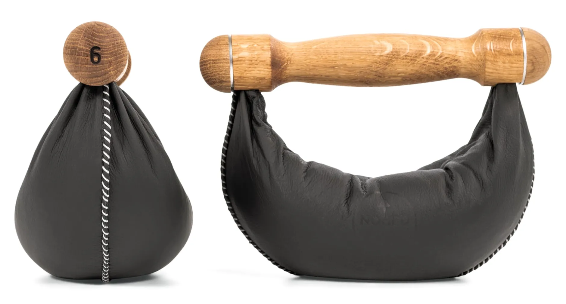 Beste, ausgesuchte Materialien sind Voraussetzung, dass die Swing Hanteln langlebige, verlässliche Trainingspartner sind. So verwendet NOHRD starkes, vegetabil gegerbtes Rindleder aus deutschen Gerbereien, das zum Schutz vor Schmutz und Schweiß zusätzlich mit Bienenwachs behandelt wird. Die Griffe werden aus dem vollen Holz gedreht, fein geschliffen und geölt. Bis daraus eine Hantel entsteht, sind viele Arbeitsschritte nötig, die sämtlich von Hand ausgeführt werden (müssen) und teils mithilfe selbst gebauter Werkzeuge und Maschinen wie die Wiegeanlage zum Befüllen der Hanteln oder die Vorrichtung zum Einbrennen der Ziffern erfolgen. Zunächst wird der Lederkorpus im Sattlerstich vernäht, ein stabilisierender Stahlbügel sowie eine Folie zur Sicherung eingezogen, diese mit Eisengranulat gefüllt und verkrimpt. Allein um nun Griff und Hantelkorpus auf Lebenszeit zu „verheiraten“, bedarf es wiederum an die zehn Arbeitsgänge: Dafür wird als Erstes der Korpus in Form gebracht, dann der Bügel mitsamt dem Leder beidseits am Griff mit Doppelgewindeschrauben montiert und zusätzlich mit Epoxyharz verklebt, bevor die Griffkappen aufgeschraubt werden – so entsteht eine dauerhafte Verbindung, die auf viele Jahre täglicher Höchstbelastung standhält. Abschließend wird die Ziffer zur Gewichtsangabe in den Griff gebrannt.