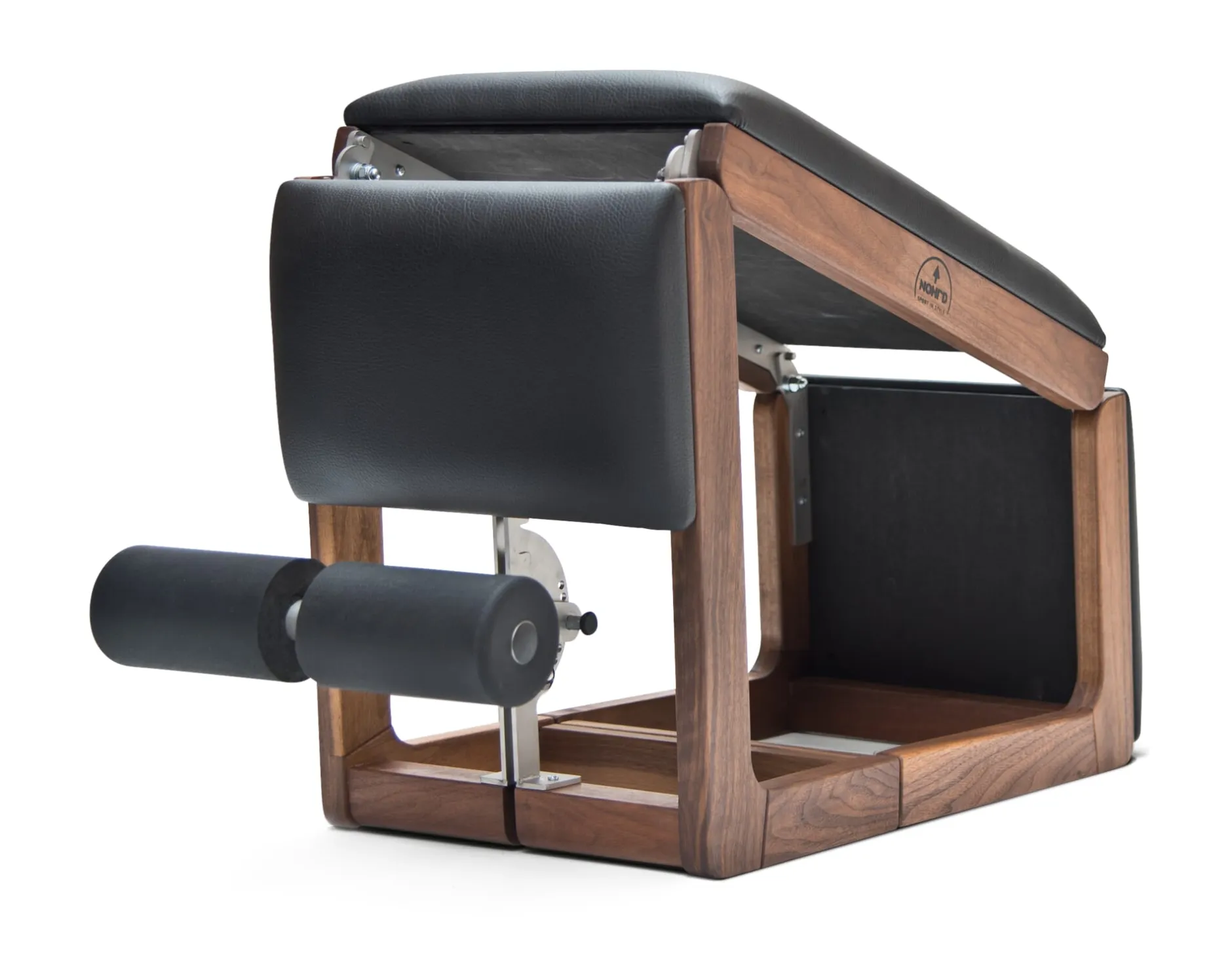 Als Fitnessgerät dient der TriaTrainer von Nohrd dem Training von Bauch-, Rücken- und Gesäßmuskeln. Viel treffender wäre es jedoch, ihn als Fitnessmöbel zu bezeichnen, denn er kommt als veritables Möbelstück daher – als solches ist er zwar nicht unbedingt zu nutzen, dennoch ist er in bester Schreinermanier verarbeitet: Der Rahmen wird aus massivem, deutschem Holz gefertigt, seine beweglichen Teile sind über stabile Metallscharniere verbunden, auch der Stellmechanismus der Fußstütze ist aus Metall. Die Polsterung aus Schaumstoff ist mit schwarzem Kunstleder bezogen. Dank Material, Design und dem geringen Platzbedarf (eingeklappt benötigt er gerade einmal 90 × 35 cm Standfläche) können Sie den TriaTrainer also getrost in Ihre Wohnung stellen, er wird allenfalls durch die asymmetrische Form auffallen. Diese ist durch seine verschiedenen Funktionen bedingt.