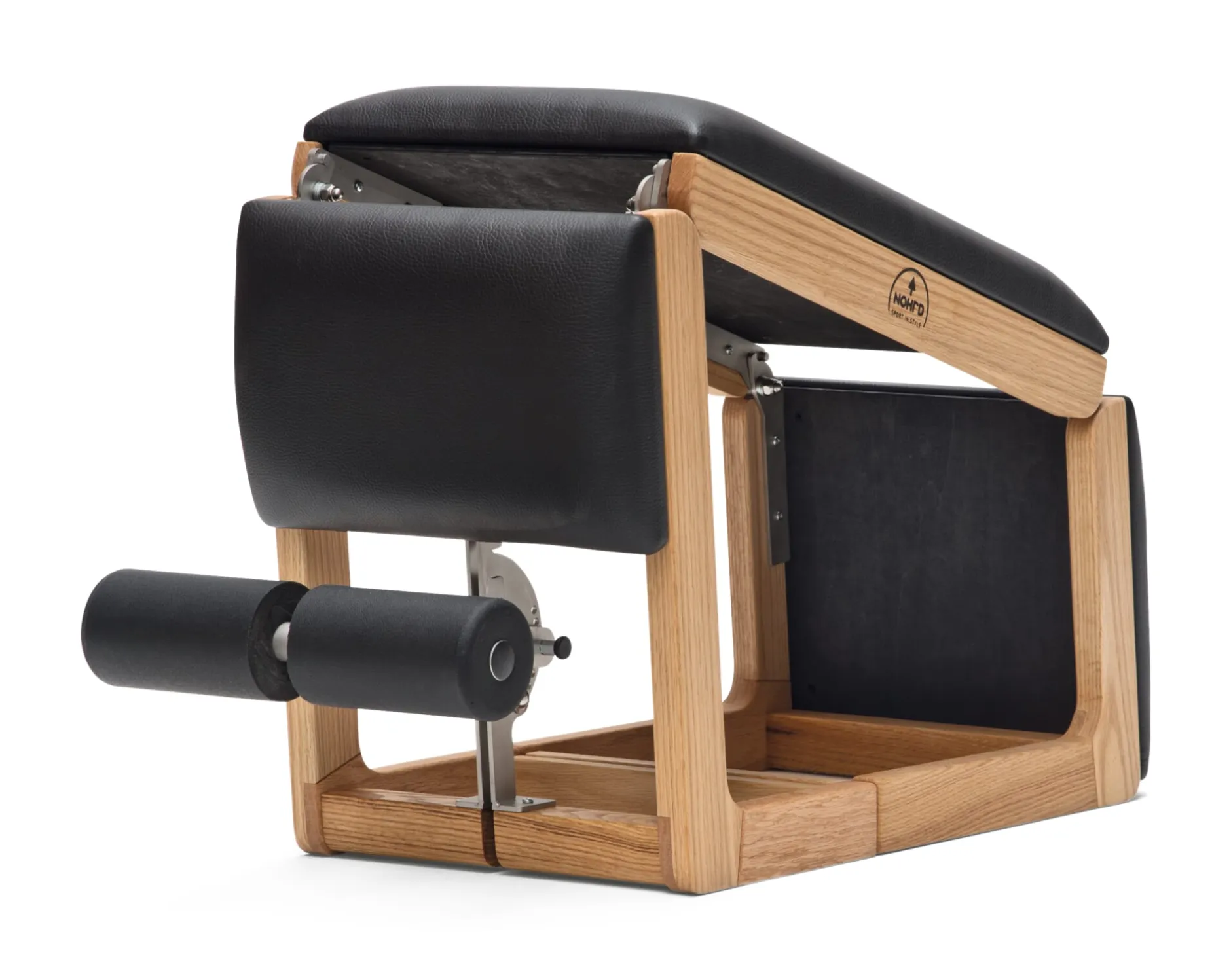 Als Fitnessgerät dient der TriaTrainer von Nohrd dem Training von Bauch-, Rücken- und Gesäßmuskeln. Viel treffender wäre es jedoch, ihn als Fitnessmöbel zu bezeichnen, denn er kommt als veritables Möbelstück daher – als solches ist er zwar nicht unbedingt zu nutzen, dennoch ist er in bester Schreinermanier verarbeitet: Der Rahmen wird aus massivem, deutschem Holz gefertigt, seine beweglichen Teile sind über stabile Metallscharniere verbunden, auch der Stellmechanismus der Fußstütze ist aus Metall. Die Polsterung aus Schaumstoff ist mit schwarzem Kunstleder bezogen. Dank Material, Design und dem geringen Platzbedarf (eingeklappt benötigt er gerade einmal 90 × 35 cm Standfläche) können Sie den TriaTrainer also getrost in Ihre Wohnung stellen, er wird allenfalls durch die asymmetrische Form auffallen. Diese ist durch seine verschiedenen Funktionen bedingt.
