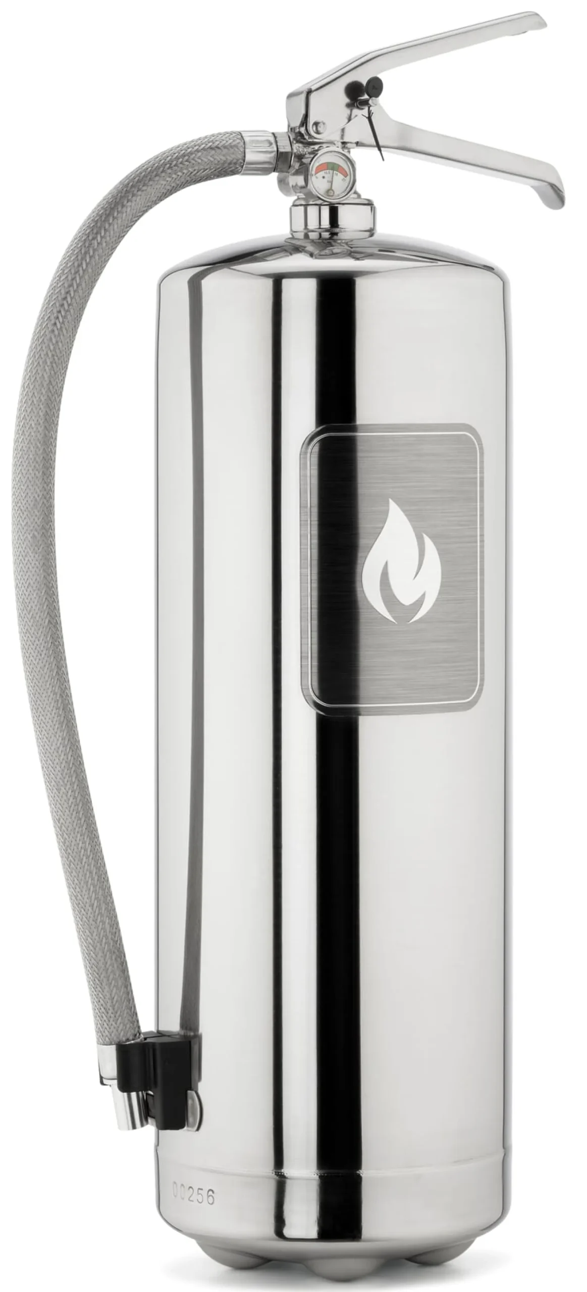 Aus handpoliertem Edelstahl hergestellt und mit einem schwarzen Lederstrap (zum Entsichern) versehen, glänzt er aber nicht nur mit klarem Design, sondern natürlich auch mit seinen inneren Werten: Der Feuerlöscher ist mit ABC-Pulver gefüllt und damit für die Brandklassen A, B und C geeignet: