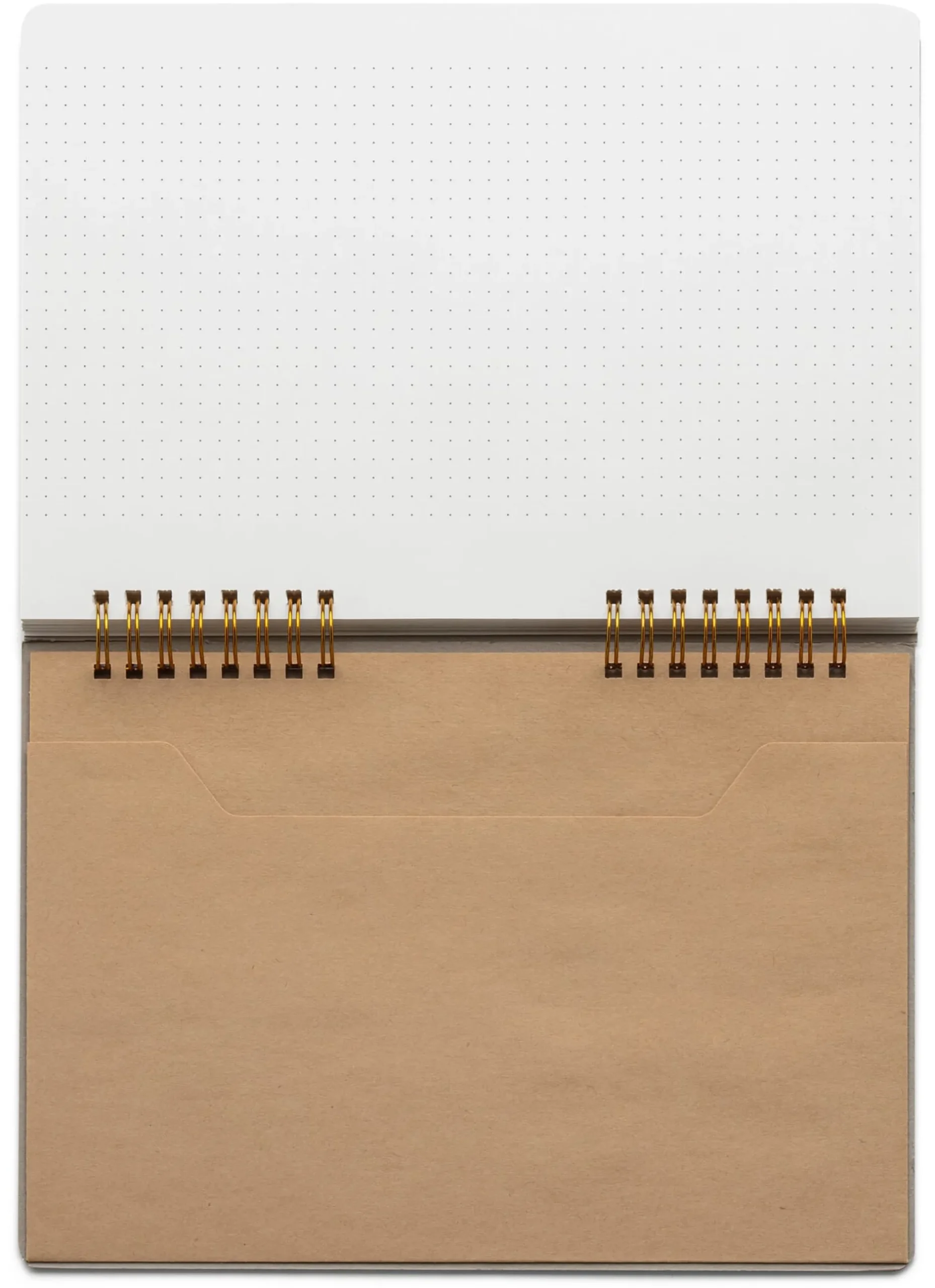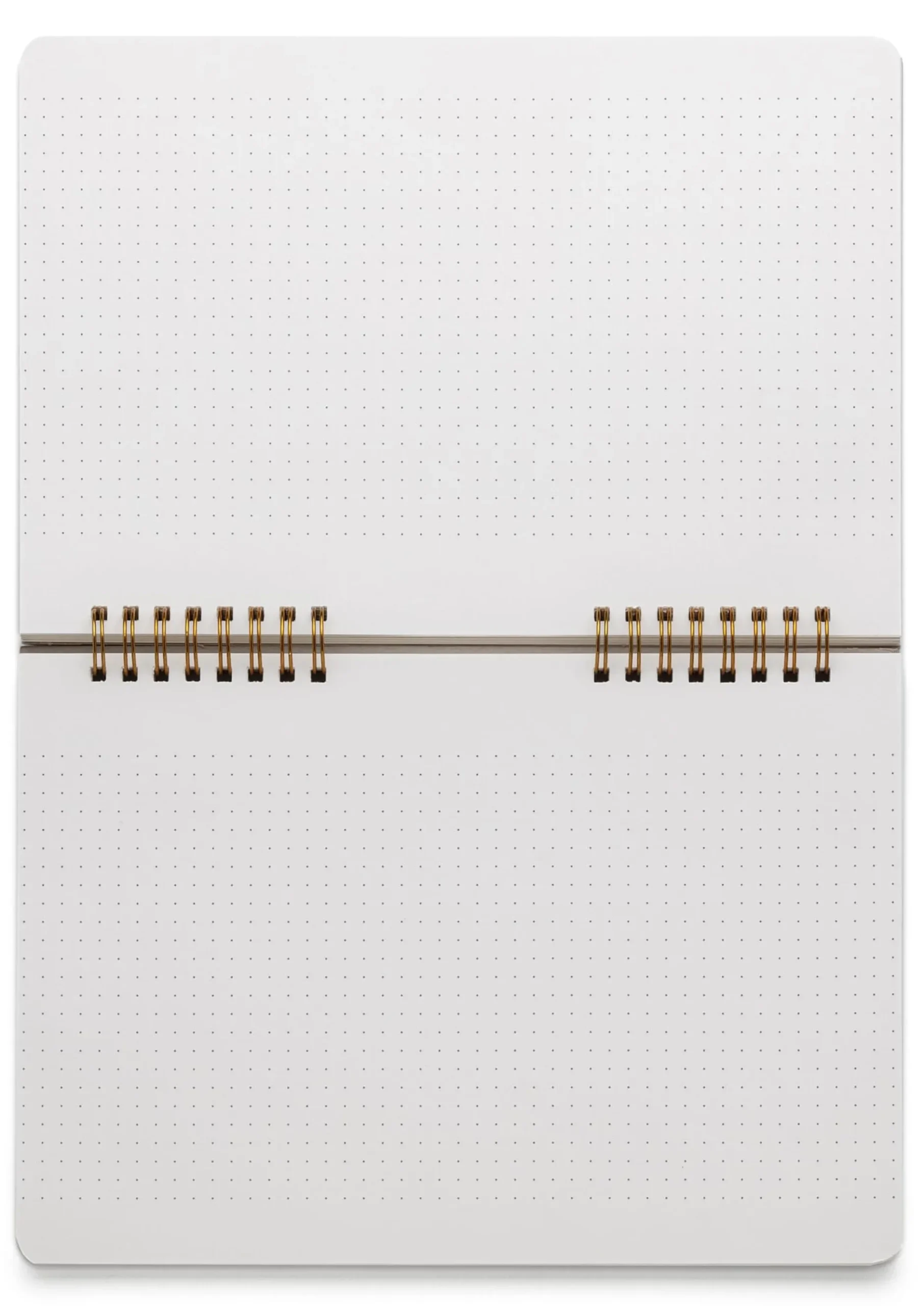 Notizbuch mit 80 Blatt (160 Seiten) aus zartweißem Naturpapier (100 g/qm) und einer Tasche aus Kraftpapier, die A5-Formate fasst. 24 × 17 cm. Spiralbindung aus vermessingtem Stahl. Deckel aus 2 mm starker, blau, schwarz oder grau bedruckter Graupappe. Hergestellt in Südkorea.