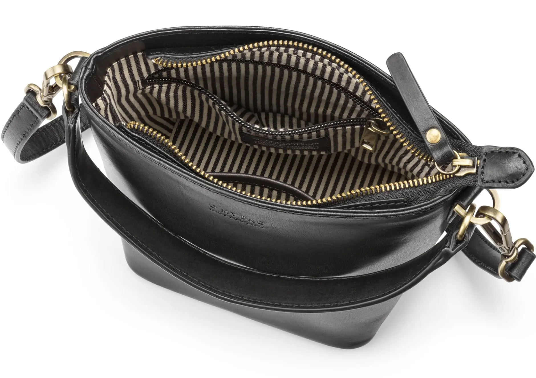 Eine sportlich-elegante wie schlichte Schultertasche im Stil einer Bucket Bag, die je nach kombinierter Bekleidung zu verschiedensten Anlässen eine gute Figur macht. Besonders praktisch: Die Tasche ist mit zwei abnehmbaren Riemen versehen – einem langen Schulterriemen und einem kurzen, gedoppelten Trageriemen, sodass sie wie eine Handtasche getragen werden kann. Aus kräftigem Rindleder mit einem großflächigen, eckigen Boden gemacht, hat sie stabilen Stand und bewahrt ihre Form, wenn sie abgelegt wird. So bietet sie stets guten Einblick in ihr geräumiges Hauptfach mit einem seitlichen Reißverschluss- und einem Steckfach. Die Tasche verjüngt sich nach oben und schließt mit einem Reißverschluss. Gefüttert ist sie mit dem für O My Bag charakteristischen blau-weiß gestreiften Baumwollköper.