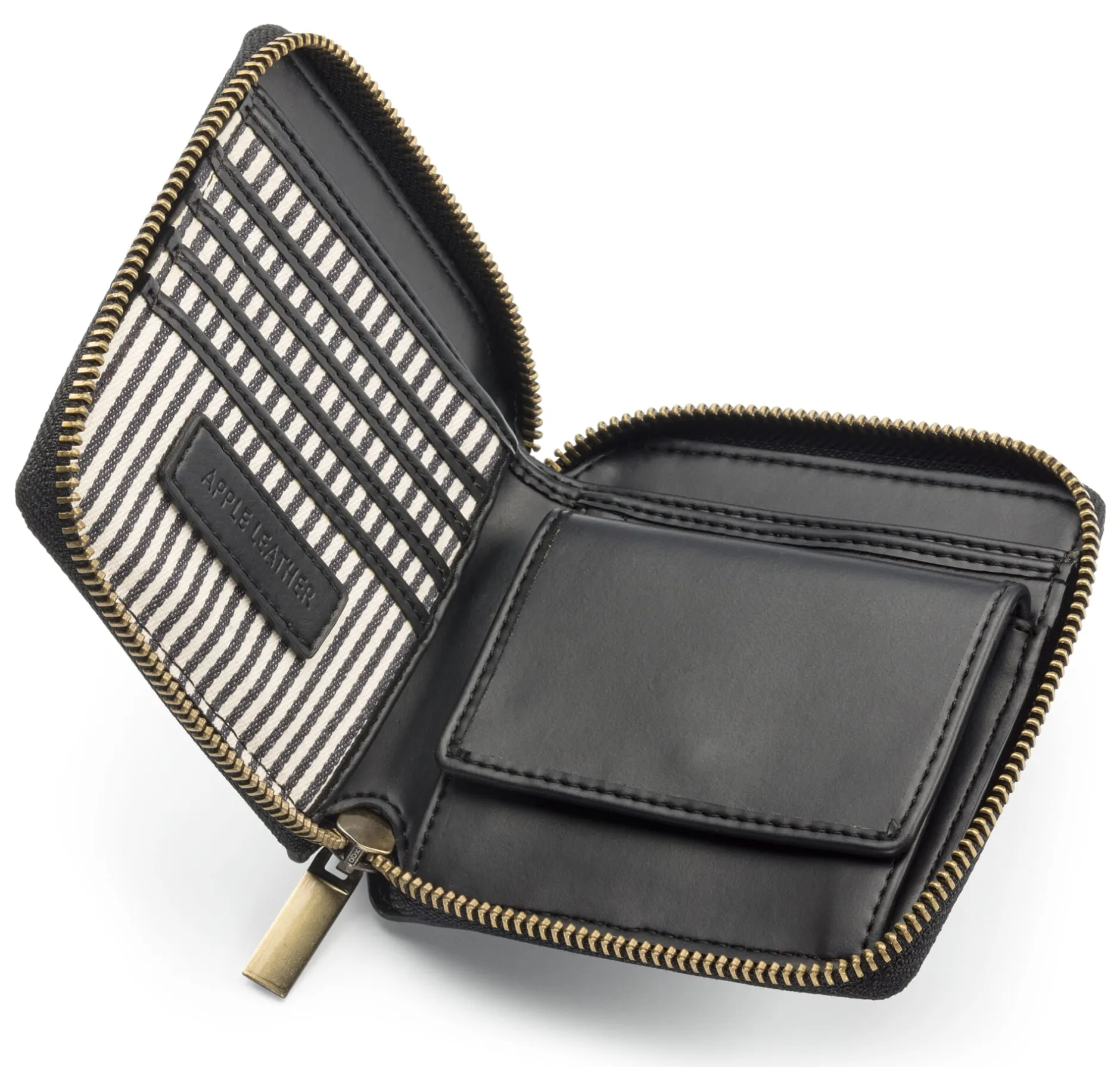 Einfach, kompakt und sehr praktisch ist diese quadratische Geldbörse, denn sie lässt sich dank des über drei Seiten umlaufenden Reißverschlusses komplett aufklappen. So können Karten, Geldscheine und Münzen bequem verstaut und überblickt werden. Dafür ist das Portemonnaie innen mit vier Kartenfächern, zwei Geldscheinfächern und einem Münzfach gearbeitet. Hinter den kleinen Fächern verbirgt sich jeweils noch ein Steckfach. Gefüttert ist es natürlich mit dem typischen gestreiften Baumwollstoff von O my Bag. Außen besteht die Geldbörse aus AppleSkin™, einer veganen Alternative, die traditionellem Leder optisch und haptisch sehr ähnlich ist.